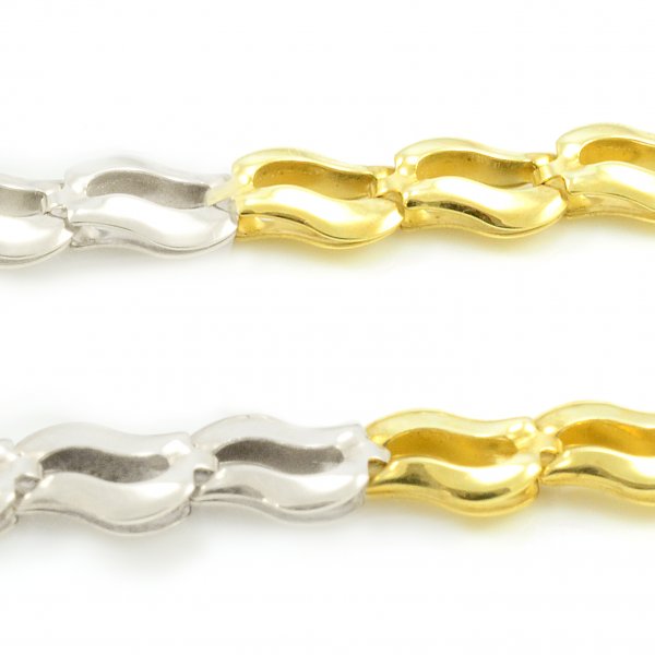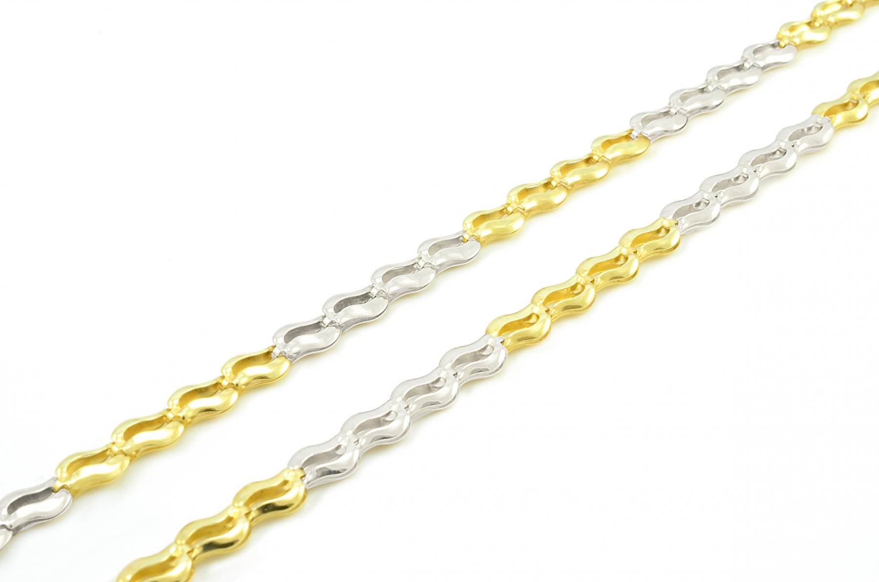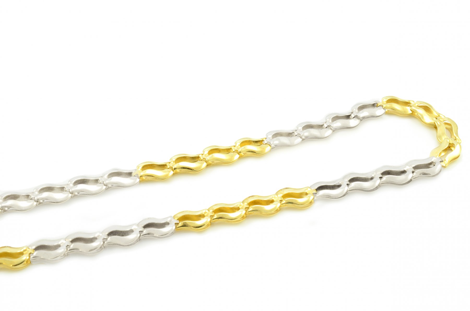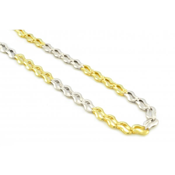 Elegantný dámsky náhrdelník vyrobený zo žltého a bieleho zlata o rýdzosti 14 karátov. Skladá sa z článkov, ktoré majú vyseknuté vnútro a sú v tvare vlniek. Dokonale obopnú krk a vytvárajú dokonalý lesk. Tento náhrdelník je obojstranný. Ako zapínanie použitá karabína. K náhrdelníku je v ponuke náramok a náušnice.