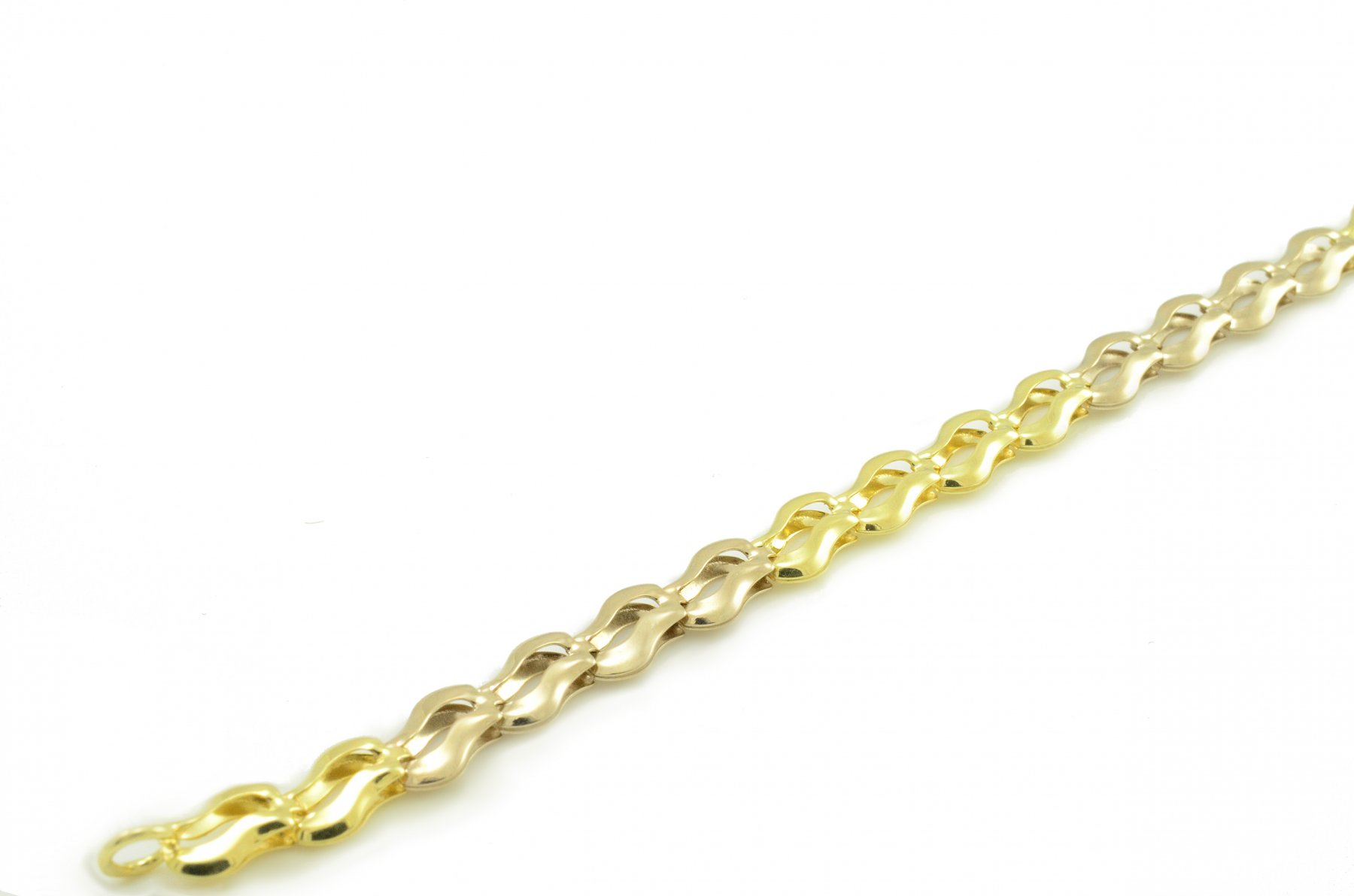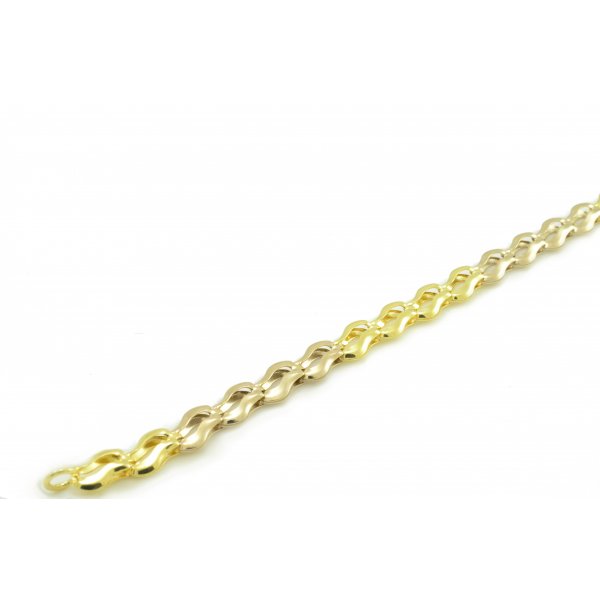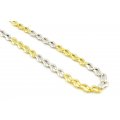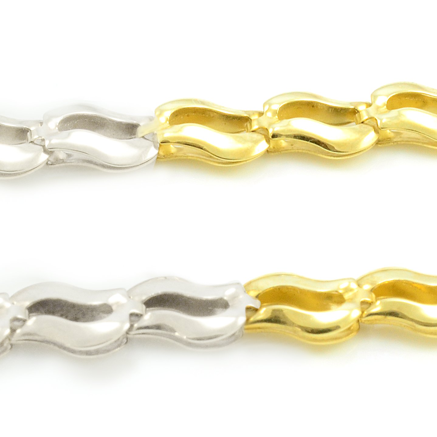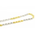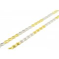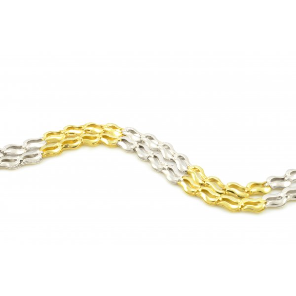 Elegantný dámsky náhrdelník vyrobený zo žltého a bieleho zlata o rýdzosti 14 karátov. Skladá sa z článkov, ktoré majú vyseknuté vnútro a sú v tvare vlniek. Dokonale obopnú krk a vytvárajú dokonalý lesk. Tento náhrdelník je obojstranný. Ako zapínanie použitá karabína. K náhrdelníku je v ponuke náramok a náušnice.
