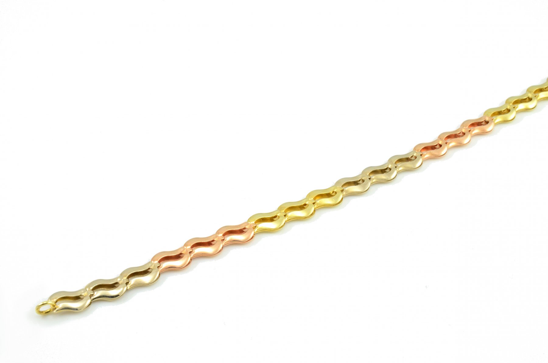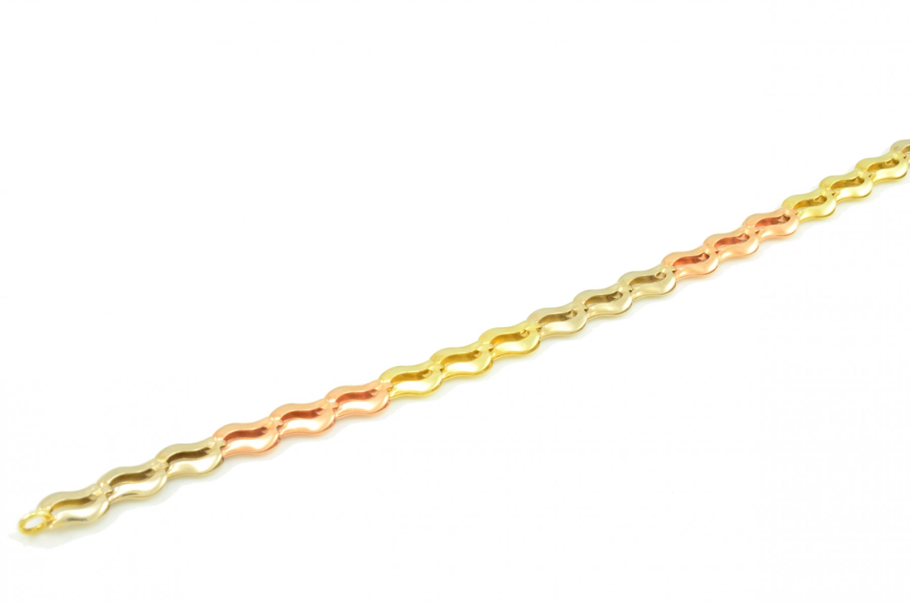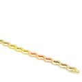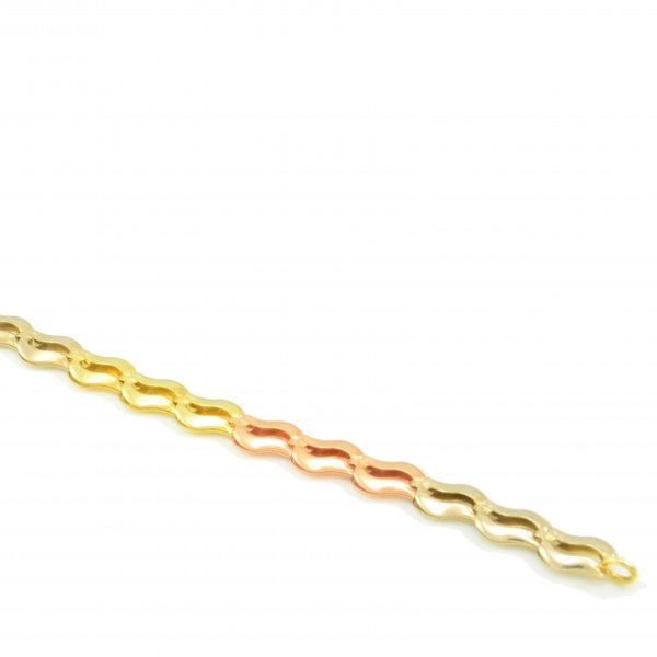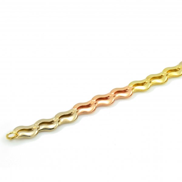 Elegantný dámsky zlatý náramok vyrobený zo žltého,bieleho a červeného zlata o rýdzosti 14 karátov. Skladá sa z článkov, ktoré majú vyseknuté vnútro a sú v tvare vlnky. Ako zapínanie je použitá karabína.Náramok je vhodný na každodenné nosenie.Náramok svojou farebnosťou zaujme každú ženu.V ponuke je aj retiazka a náušnice-