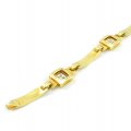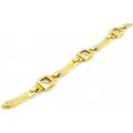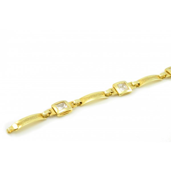 Elegantný dámsky náramok vyrobený zo žltého zlata o rýdzosti 14 karátov. Skladá sa z poloblúkových článkov ktoré sú stredom pieskované.Medzi jednolivými článkami sú fasované číre zirkóny. Náramok tým má dokonalý lesk. Ako zapínanie použitá karabína.Náramok na ruke krásne vyniká svojou veĺkosťou.Vhodný je na každodenné nosenie ale môžete ho využiť aj na svadbu,promócie a iné slávnosti.K náramku je dostupný aj prsteň a náhrdelník.