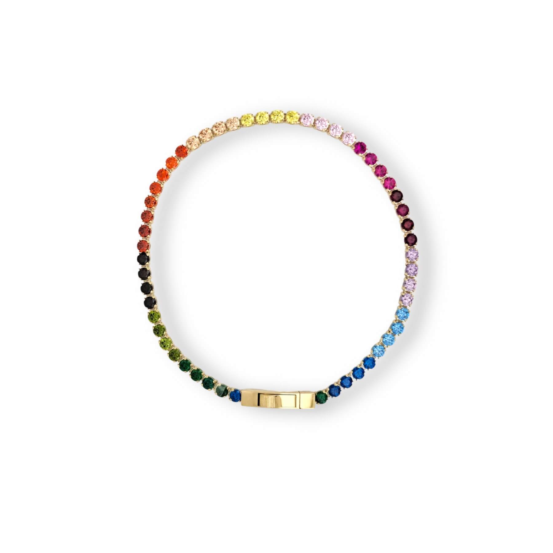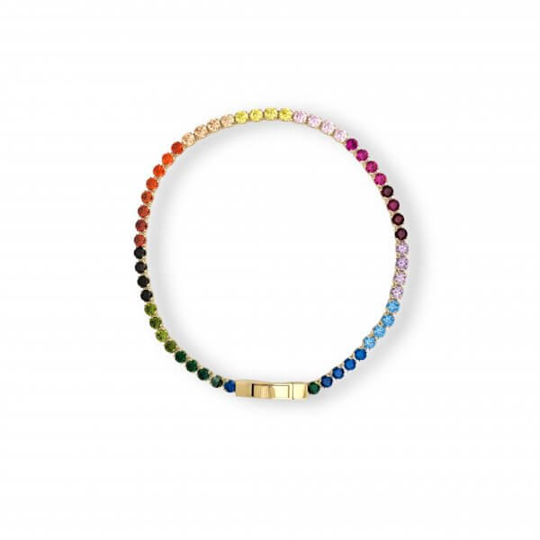 Unikátny tenisový náramok vyrobený zo žltého zlata o rýdzosti 14 karátov. Skladá sa z jednotlivých očiek, ktoré majú fasované farebné zirkóny. Na zapínanie je použitý zasúvací patent (prasiatko), ktorý je je jedným z najbezpečnejších zapínaní. Tento druh šperku je odrazom elegantnosti a vznešenosti. Je vhodný na významné udalosti, plesy, svadby, promócie.