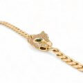 Luxusný náramok v tvare pantera. Na prvý pohľad zaujme svojím jedinečným dizajnom. Náramok je vyrobený zo 14kt lesklého zlata, doplnený o malé číre zirkóny. Oči pantera majú fasované zelené zirkóny. Pancerový vzor náramku s hlavou patntera dodáva nádych luxusu. Na zapínanie je použitý väčší skákací krúžok. S týmto luxusným šperkom zaujmete na prvý pohľad, preto ho musíte mať.