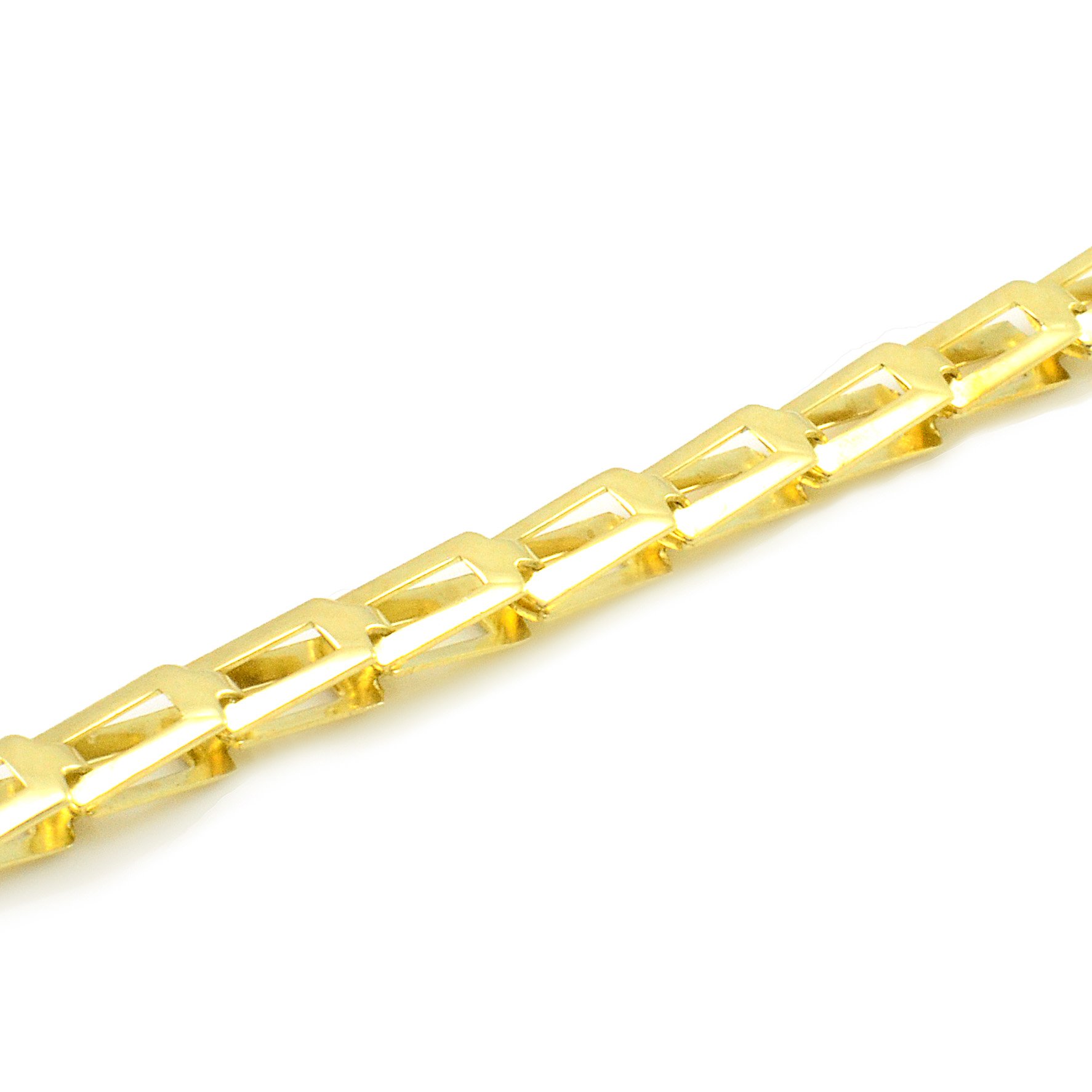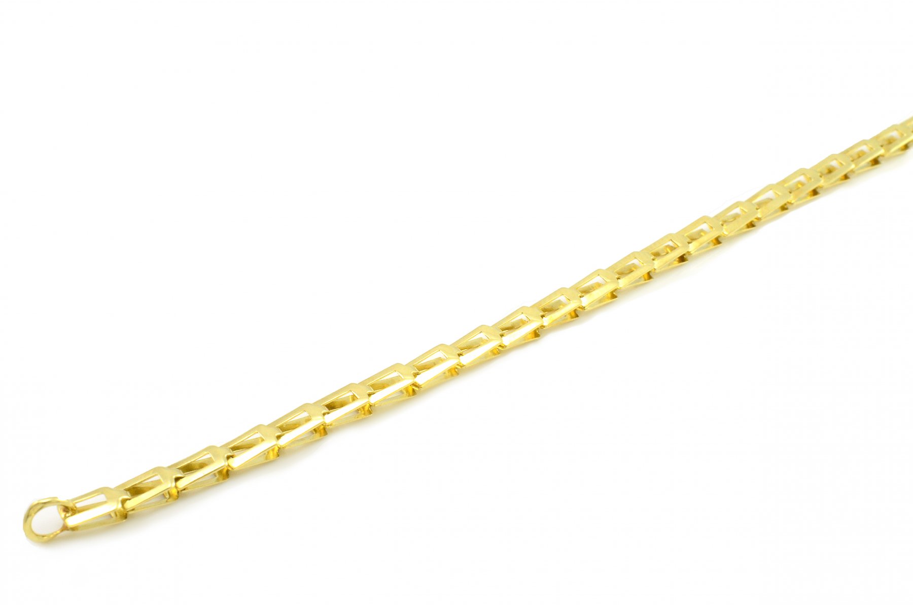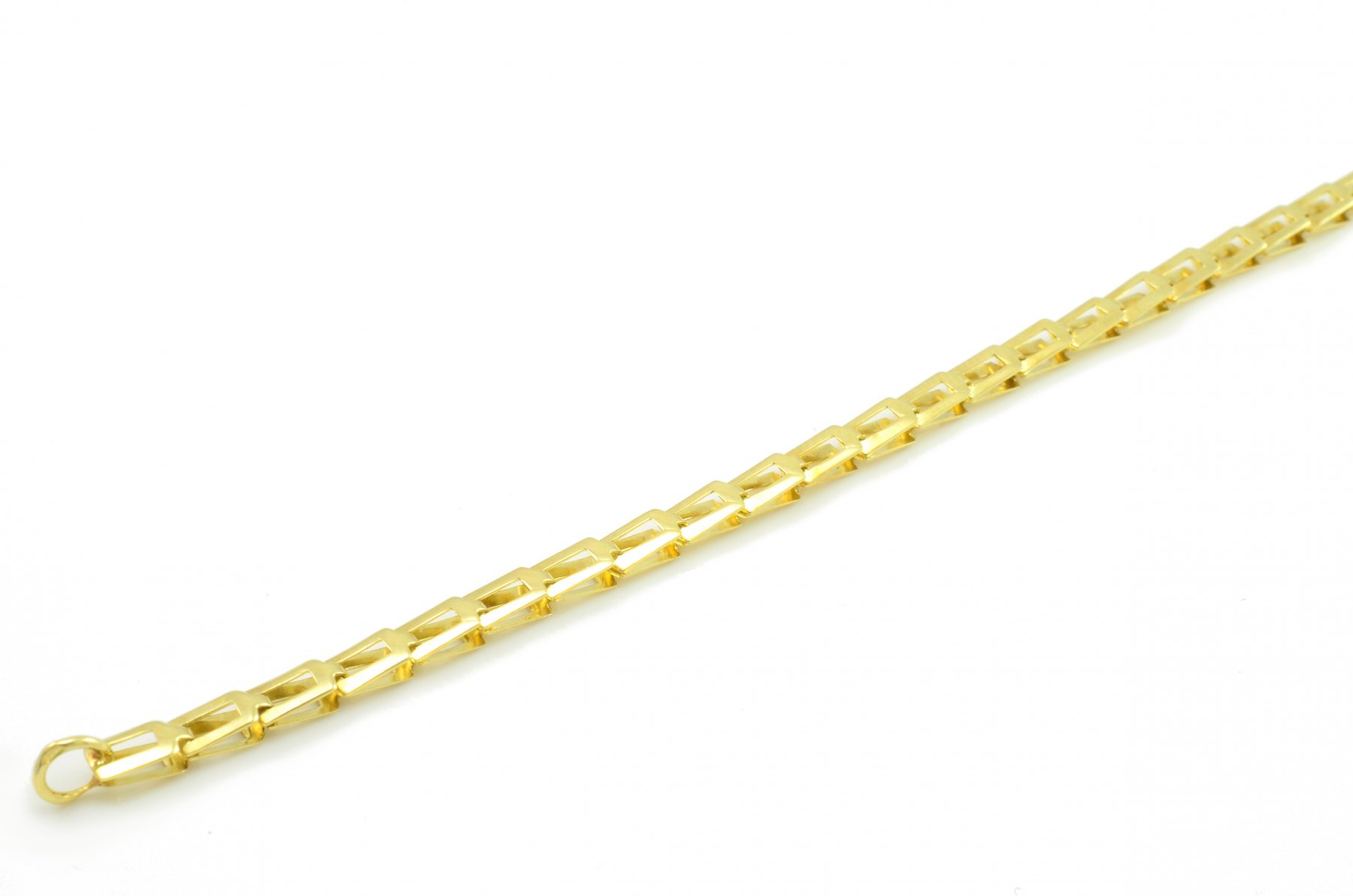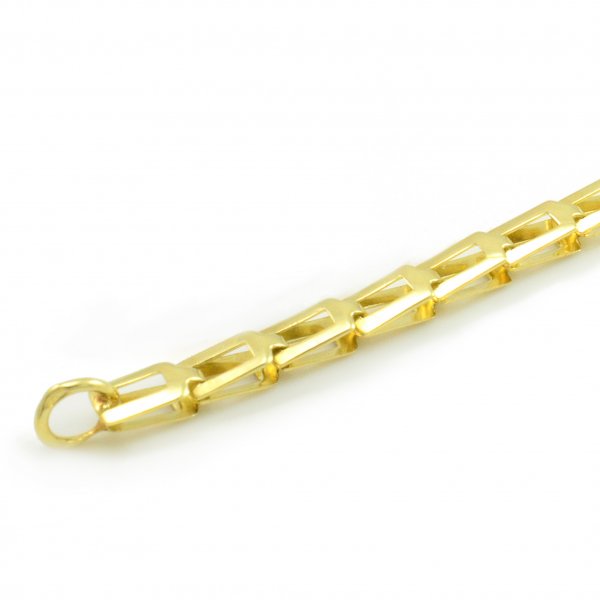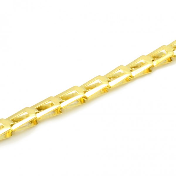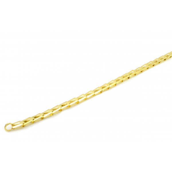Krásny náramok vyrobený zo žltého zlata o rýdzosti 14 karátov. Skladá sa z obdĺžnikových článkov,ktoré do seba pekne zapadajú. Vytvárajú dokonalý lesk. Tento náramok je vhodný pre ženy aj mužov. Je obojstranný. Ako zapínanie použitá karabína.Šírka článkov je 3,85 mm,výška 4,75 mm,hrúbka 2,20 mm. K náramku je možnosť dokúpenia aj retiazky takého istého vzoru.