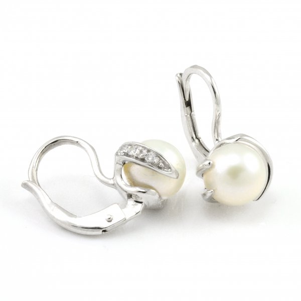 Veľmi pekné a elegantné perlové náušnice, ktoré sú doplnené o tri malé zirkóniky v prepracovanom fasungu. Každá z nás chce vlastniť niečo výnimočné a perlové náušnice sú obľúbený druh šperku, ktorý by nemal chýbať vo Vašej šperkovnici. Na uchu vyzerajú náušnice výnimočne. Vďaka týmto náušniciam vždy zažiarite. Majú patentové zapínanie, ktoré je veľmi praktické a pohodlné.
