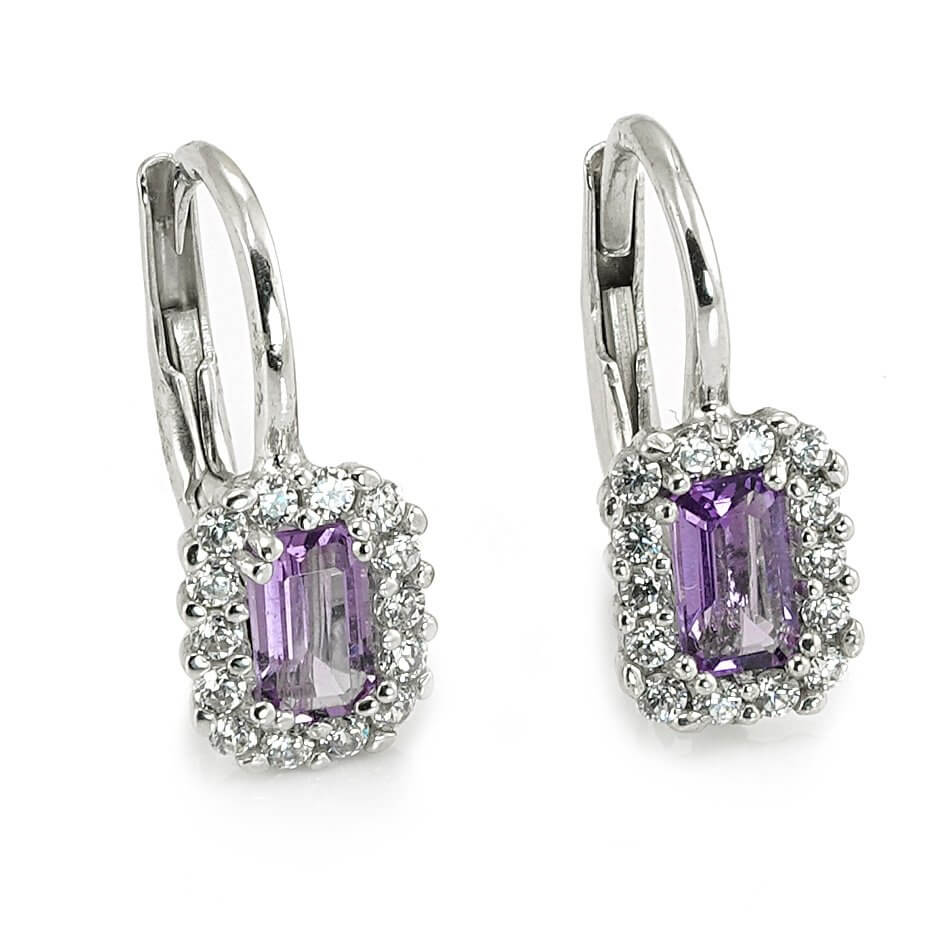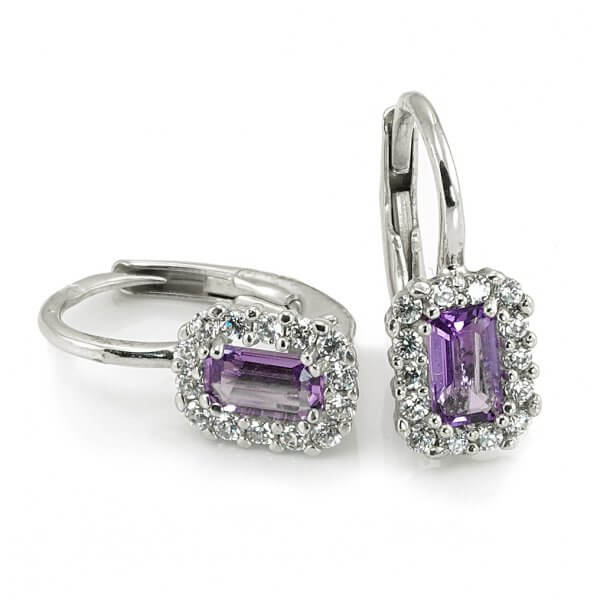 Náušnice z bieleho zlata s fialovým zirkónom a kamienkami po obvode