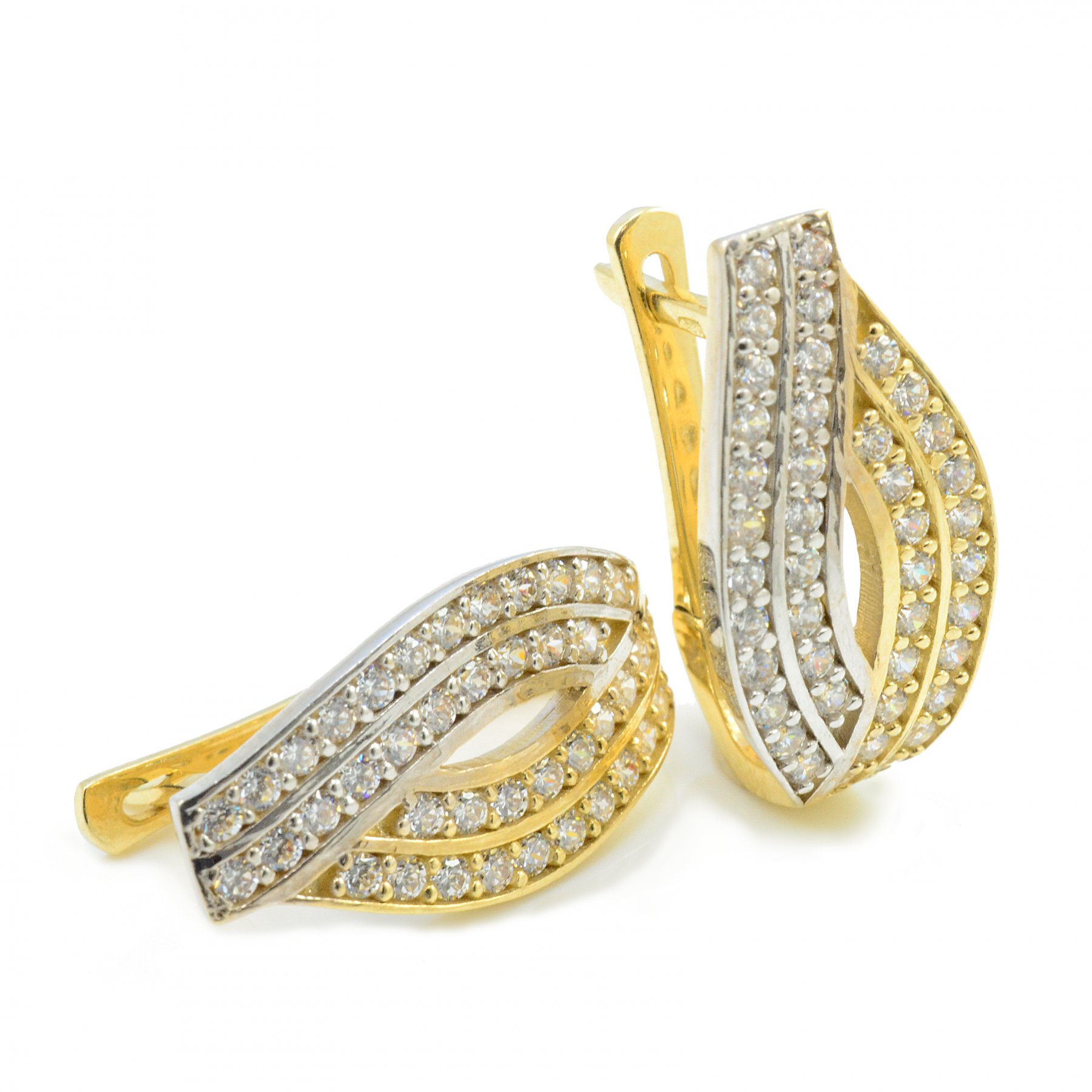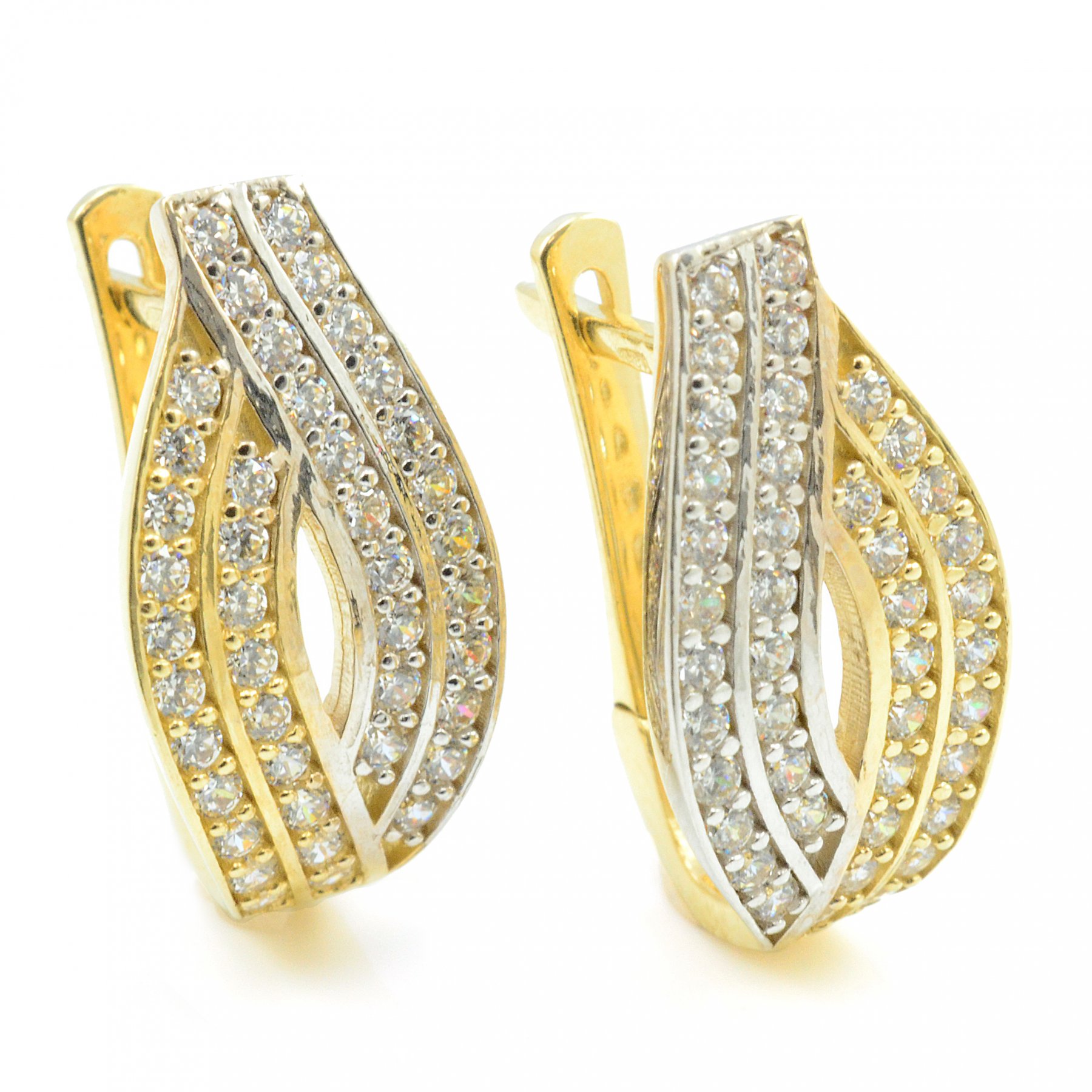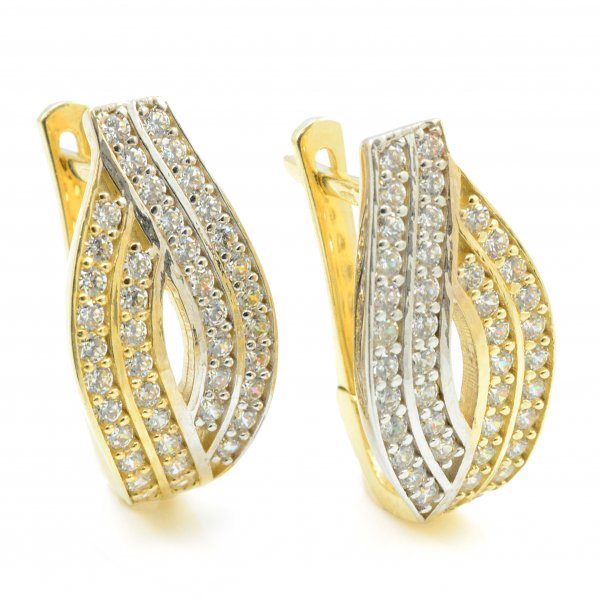 Veľmi elegantné náušnice zo žltého a bieleho zlata dekorované dvojradovými fasovanými zirkónmi. Uzatváranie náušníc je na francúzky patent. Vďaka tomuto typu zapínania sa hodia aj na uško, ktoré nie je vhodne prepichnuté a potrebujete zakryť nejaký nedostatok. Vďaka zirkónom sa krásne ligocú. Tieto náušnice očaria všetky generácie žien a sú krásnym doplnkom. K náušniciam ponúkame prsteň a prívesok. Vhodné na svadbu, promócie ale aj na každodenné nosenie.