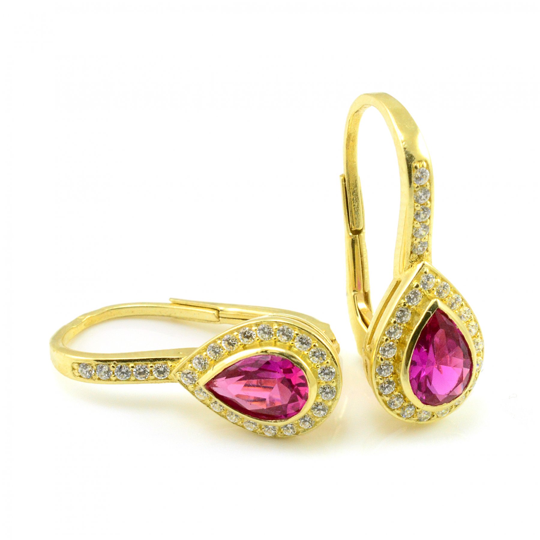Náušnice zo žltého zlata slzy so syntetickým rubínom obkolesený zirkónikmi