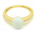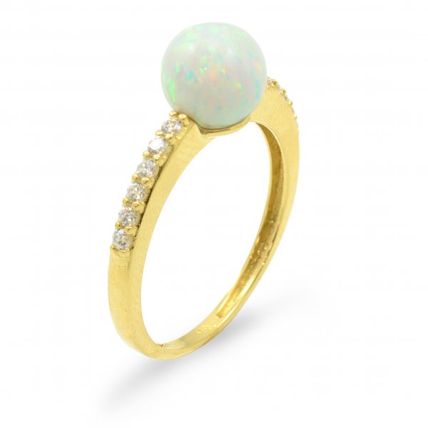 Túžite po výnimočnom šperku, ktorý má krásne dúhové odlesky? Prsteň je zo žltého 14 kt zlata. Dizajnový tvar bieleho opálu v guličke dodáva prsteňu výnimočnosť. Priemer opálovej guličky je 7 mm. Po bokoch šíny je fasovaných 6 čírych zirkónov po každej strane. Číre zirkóny dodajú prsteňu vysoký lesk. Krásne dúhové odlesky z bieleho opálu očaria každú z nás. Prsteň Vás skrášli na rôznych spoločenských akciách na svadby, stužkové, plesy.