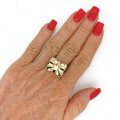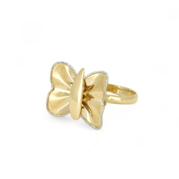 Dizajnový, luxusný prsteň je vyrobený zo žltého 14 kt zlata s hladkým povrchom vo vysokom lesku. Krídla motýľa sú šikovne prepracované do detailov. Kraje krídiel jemne lemuje biele zlato. Prsteň v tvare motýľa evokuje voľnosť, slobodu a to robí zo šperku robí doplnok s poriadnou dávkou inovácie a kreativity. Prsteň na ruke pôsobí elegantne a bude sa Vám hodiť ku každodennému outfitu. Tento šperk jednoducho musíte mať vo svojej zbierke.