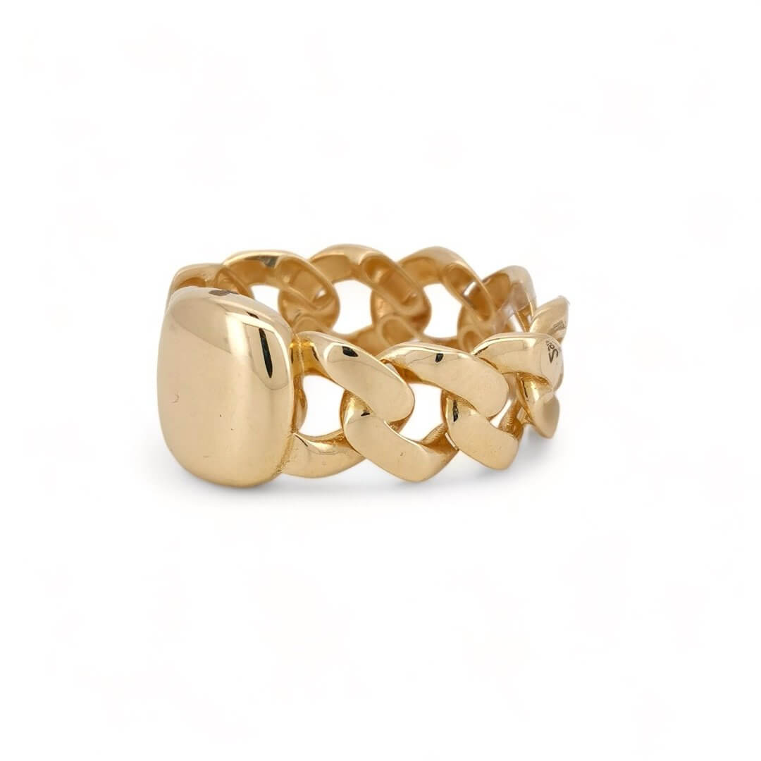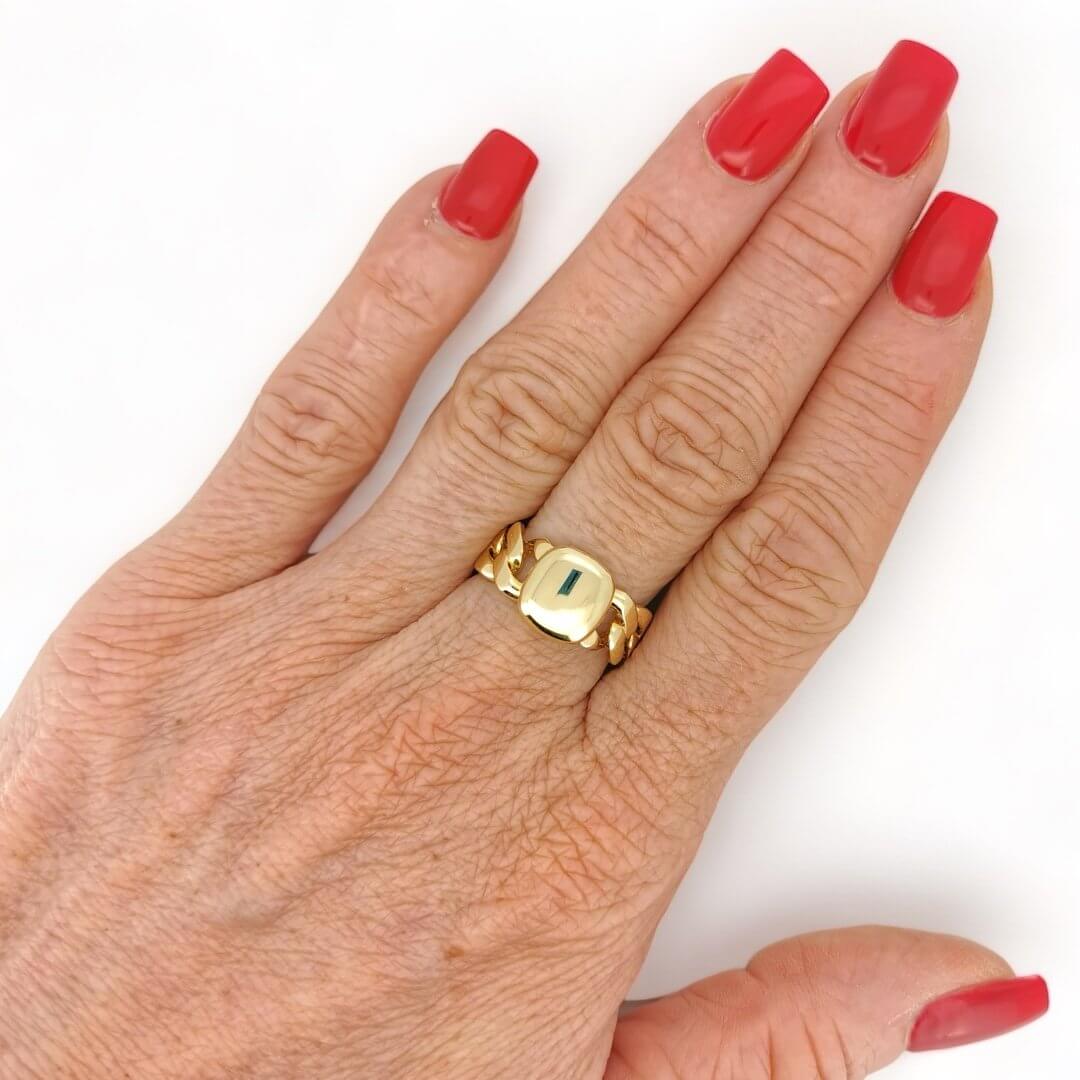 Dizajnový, luxusný prsteň je vyrobený zo žltého 14 kt zlata s hladkým povrchom vo vysokom lesku. Prsteň pripomína svojimi prepojenými očkami reťaz, ktorá zo šperku robí doplnok s poriadnou dávkou inovácie a kreativity. Prsteň na ruke pôsobí elegantne a bude sa Vám hodiť ku každodennému outfitu. Šperk ktorý musíte mať vo svojej zbierke.