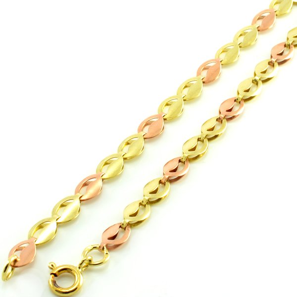 Elegantná dámska retiazka vyrobená zo žltého a červeného zlata rýdzosti 14 karátov. Skladá sa z článkov, ktoré majú vyseknuté vnútro a sú v tvare kávových zŕn, ktoré vytvárajú dokonalý lesk. Ako zapínanie použitá karabinka.