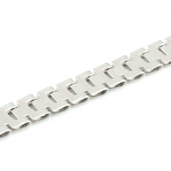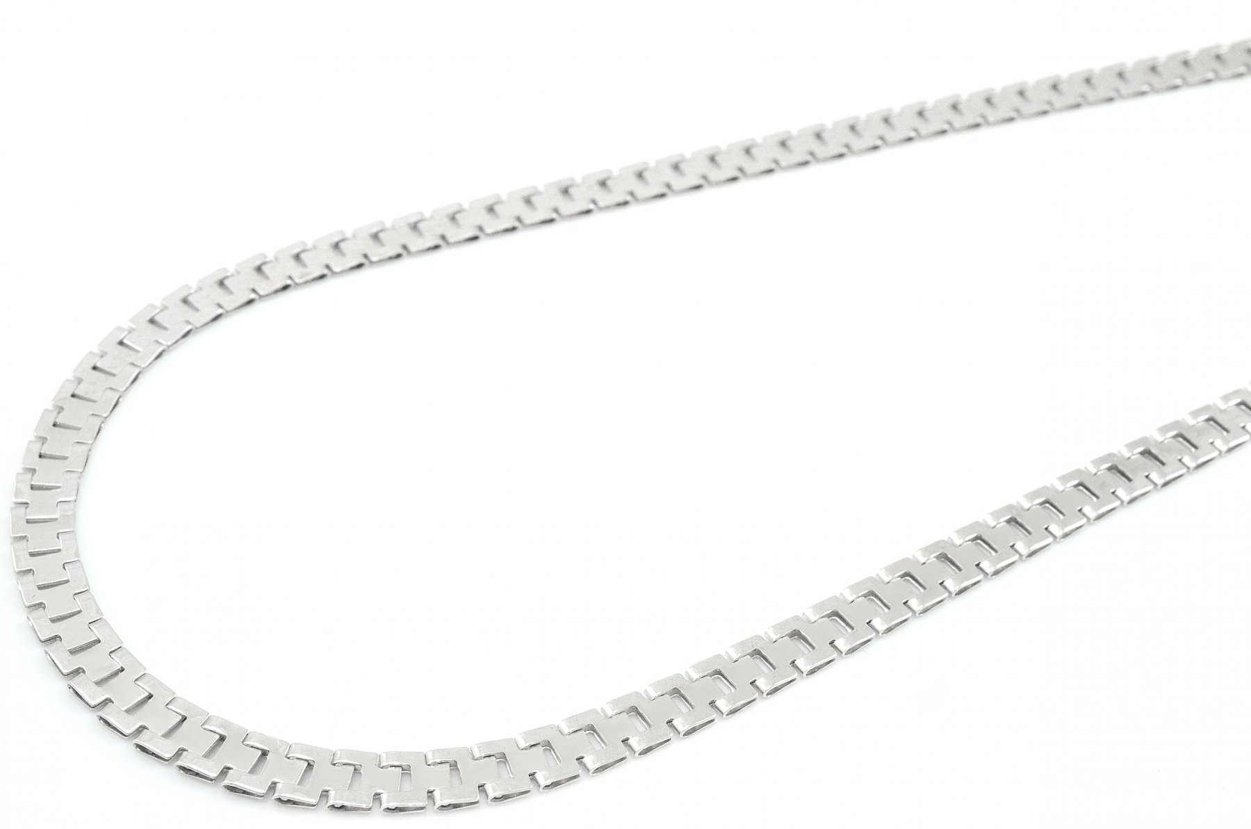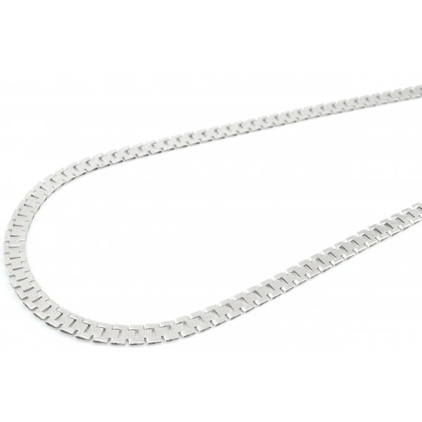Elegantná dámska retiazka vyrobená z bieleho zlata o rýdzosti 14 karátov. Skladá sa z článkov, ktoré sú ploché. Vytvárajú dokonalý lesk. Tento náhrdelník je obojstranný. Ako zapínanie použitá karabína.K náhrdelníku máme v ponuke aj náramok.
