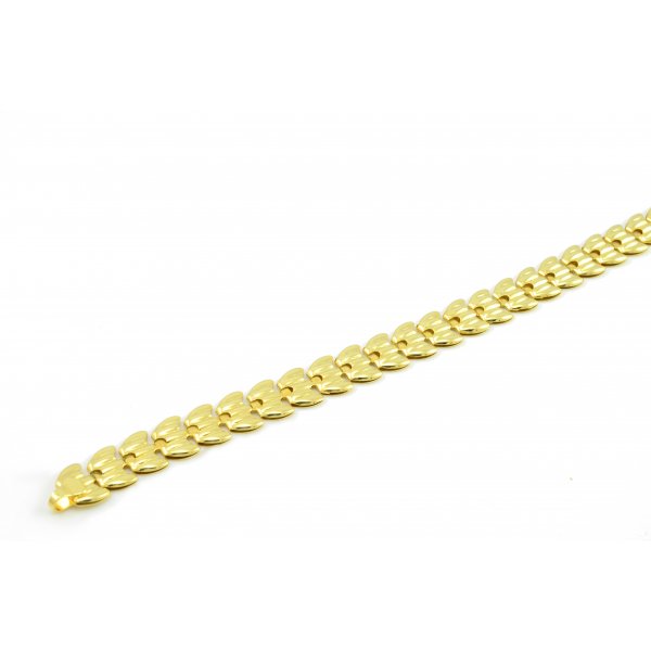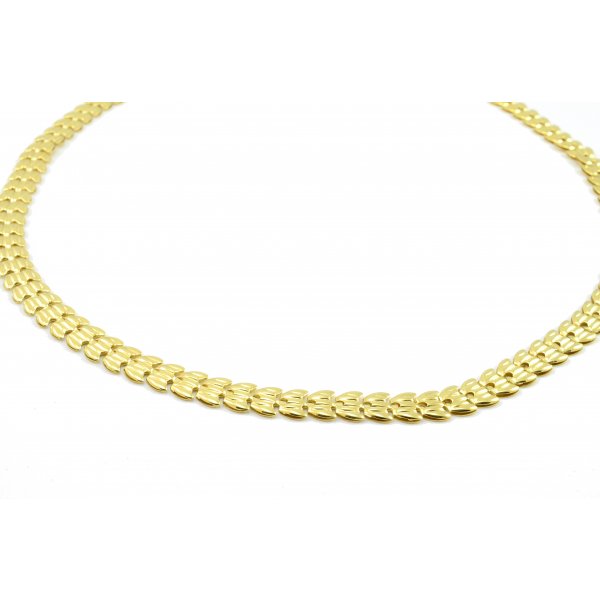 Elegantná dámska retiazka vyrobená zo žltého zlata o rýdzosti 14 karátov. Skladá sa z plastických článkov.Z vrchnej strany vytvárajú plastický vzhľad.Spodná strana je hladká,lesklá. Tento náhrdelník je obojstranný. Ako zapínanie použitá karabína.Rozmery jednotlivých článkov sú:š -7,60 mm,v - 4,50 mm,h - 1,25 mm.K náhrdelníku ponúkame aj náramok a náušnice.Náhrdelník pôsobí veľmi luxusne a skrášli každú ženu.