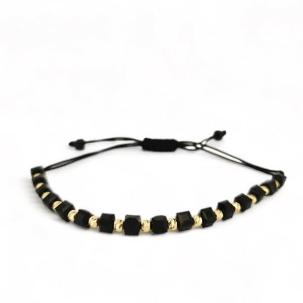 Čierny náramok s čiernymi krištáľmi a zlatými guličkami.