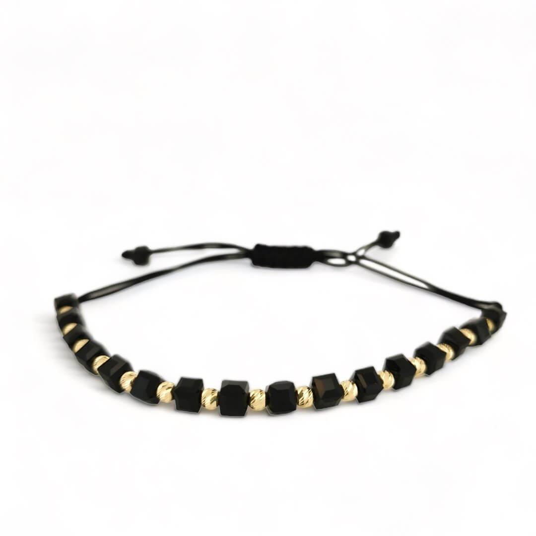 Moderný unisex náramok na čiernej šnúrke s drobnými čiernymi krištáľmi doplnený o zlaté gravírované guličky zo žltého zlata v 14 karátovej rýdzosti. Šnúrka je uviazaná na pohyblivých uzlíkoch, takže dĺžku náramku si sama regulujete. Tento netradičný šperk osvieži každý Váš outfit. Originálny darček pre milovníkov farebných a výrazných šperkov.