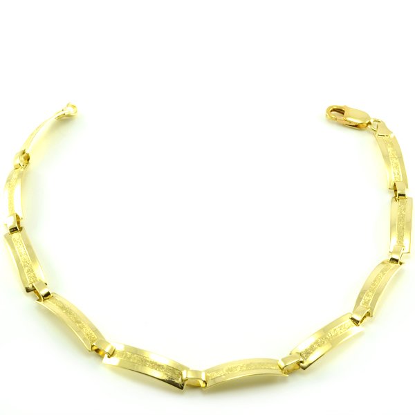 Užší formát platničkového unisex náramku vyrobeného zo žltého zlata. Každá platnička je dlhá 14.5 mm a široká 3.5 mm. Platničky sú navzájom prepojené silným a kvalitným kusom zlata. Stred náramku je omatovaný diamantovým hrotom. Tento typ povrchovej úpravy sa vyznačuje dlhou životnosťou a veľmi zaujímavým odleskom, ktorý imituje odraz svetla ako pri kameňoch. Samozrejmosťou je pevne spojené zapínanie s náramkom. Použitá je karabína. Náramok má platničky jemne preklepnuté, aby čo najlepšie sadol na ruku.