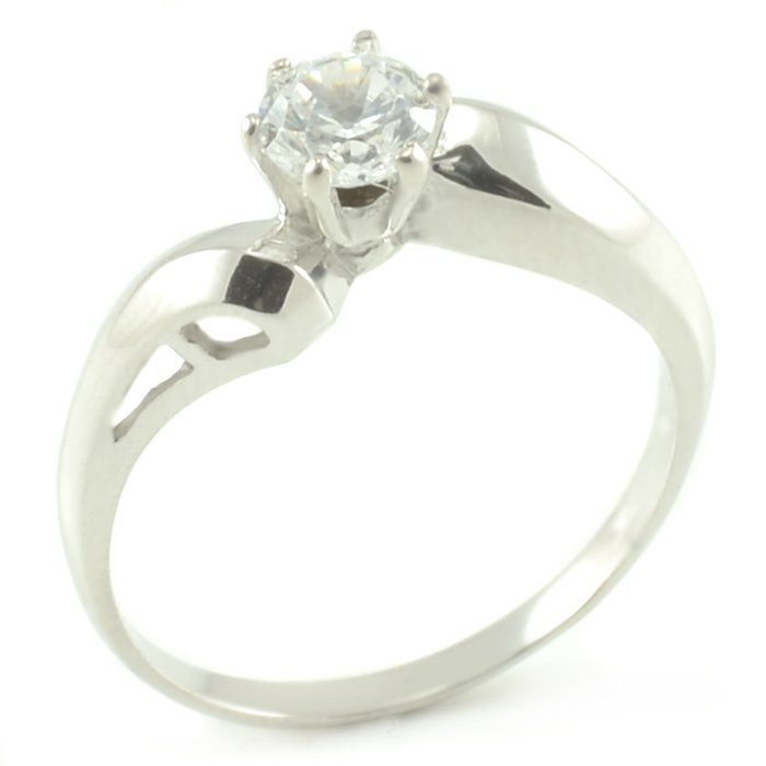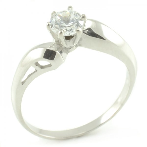 Veľmi luxusný zásnubný prsteň vytvorený z bieleho zlata. Elegantný typ prsteňa v zaujímavom a pútavom prevedení. Typ, ktorý sa vyznačuje svojou jemnosťou pevného spracovania. Prsteň sa skladá zo šíny, ktorá sa jemnučko rozširuje smerom ku majestátnej korunke. Šína zásnubného prsteňa pod korunkou je jemne otočená do pravej strany z každého pohľadu. Aj vďaka tomu pôsobí zásnubný prsteň neobyčajne a zaujímavo. Na prste vašej vyvolenej bude unikátny. Šesť kusov praciek, ktorými je uchytený hlavný kameň sa postará o to, aby zirkón bol vždy na svojom mieste.