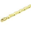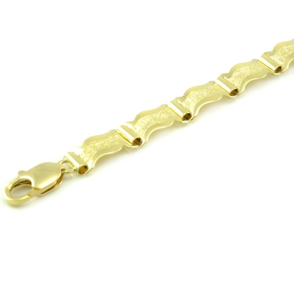 Veľmi elegantný ale zároveň mohutný náramok vyrobený zo žltého zlata o rydzosti 585/1000. Široké platničky sú vyrezané do vlnkového tvaru. Navzájom sú pospájané okrúhlymi šanírmi, ktoré ich bez problémov udržia pohromade. Stred každej platničky je omatovaný diamantovým hrotom, čo vytvára zaujímavý odraz svetla.Opačná strana náramku je zaleštená do maximálneho lesku.Ako zapínanie je použitá kvalitná karabína.Cieľová skupina pre tento šperk sú najmä ženy, ale nie je výnimkou, keď si ho zakúpi muž.