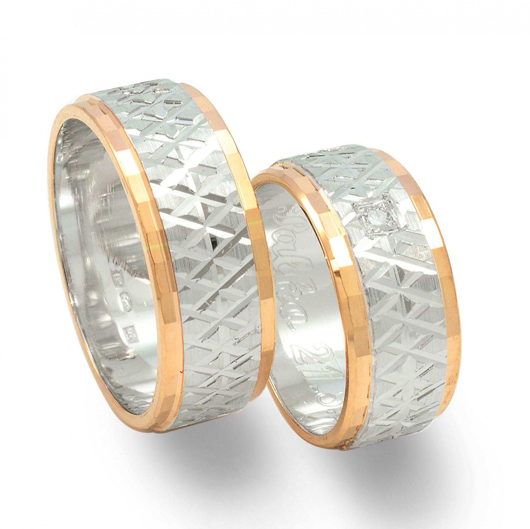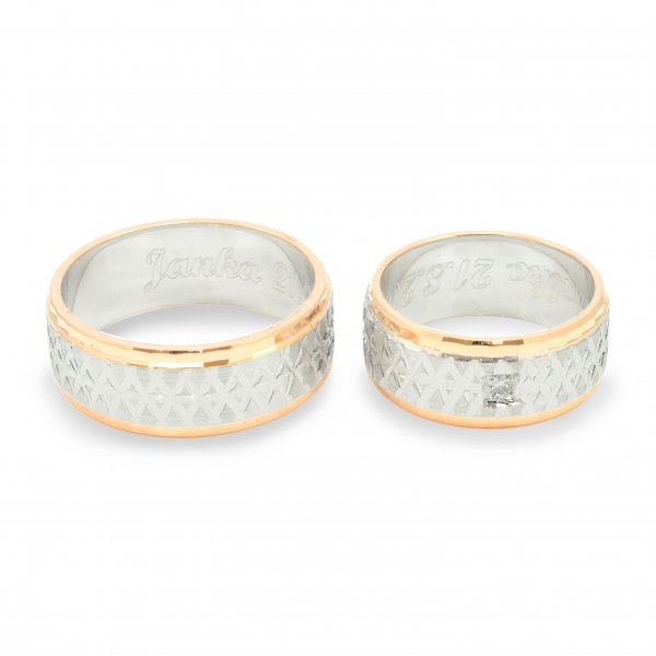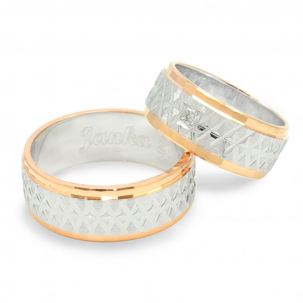 Svadobné obrúčky vyrobené z bieleho a červeného zlata. Pár plochých obrúčok širokých 7.5 mm. Krásne svadobné obrúčky gravírované diamantovým nožom vytvárajú dokonalý vzhľad, nadväzujúci na neošúchanú klasiku v modernom štýle. Ručne vyrábané svadobné obrúčky a leštené do maximálneho lesku.Tieto obrúčky sú masívnejšie a vďaka svojej šírke krásne vyniká krásne gravýrovaný vzor.