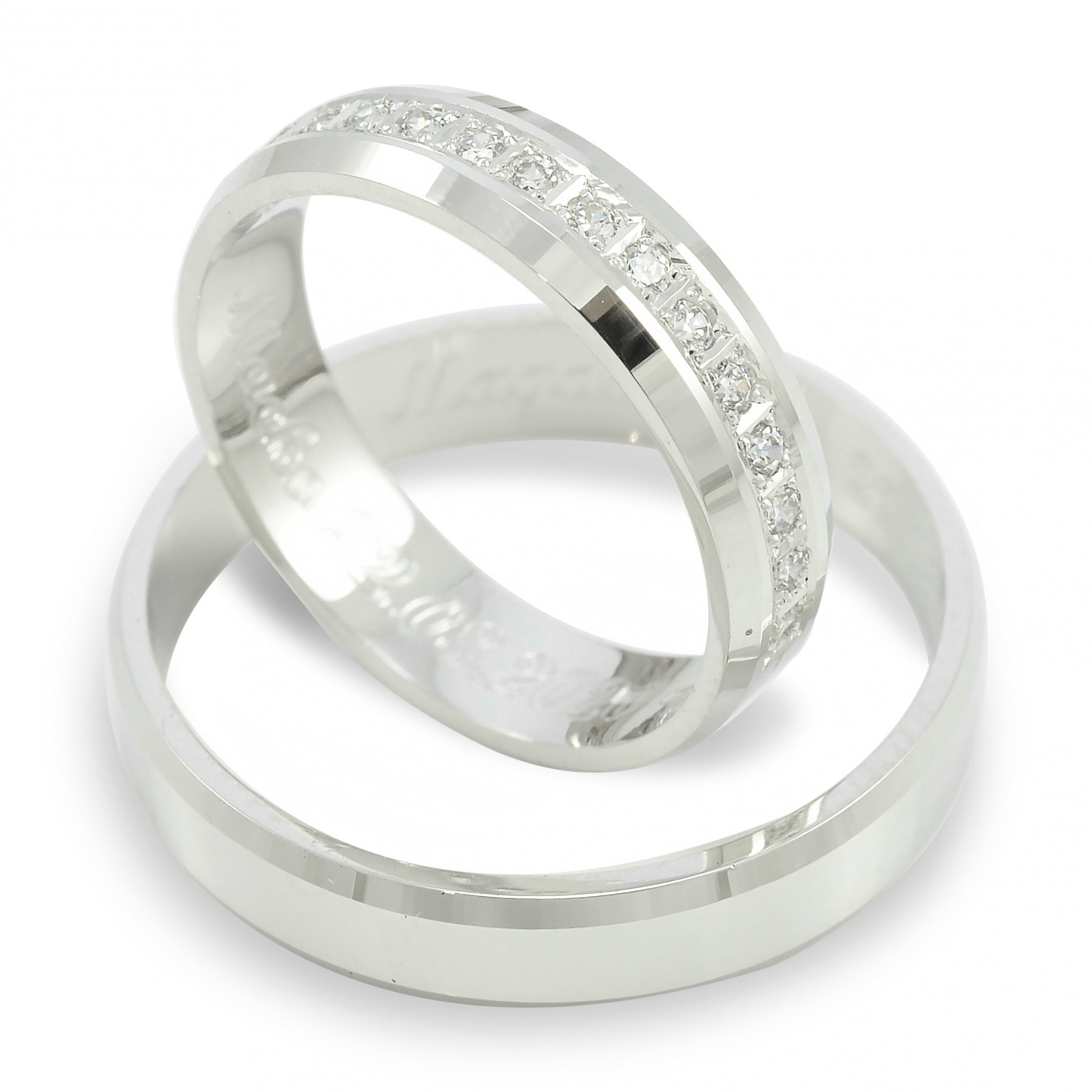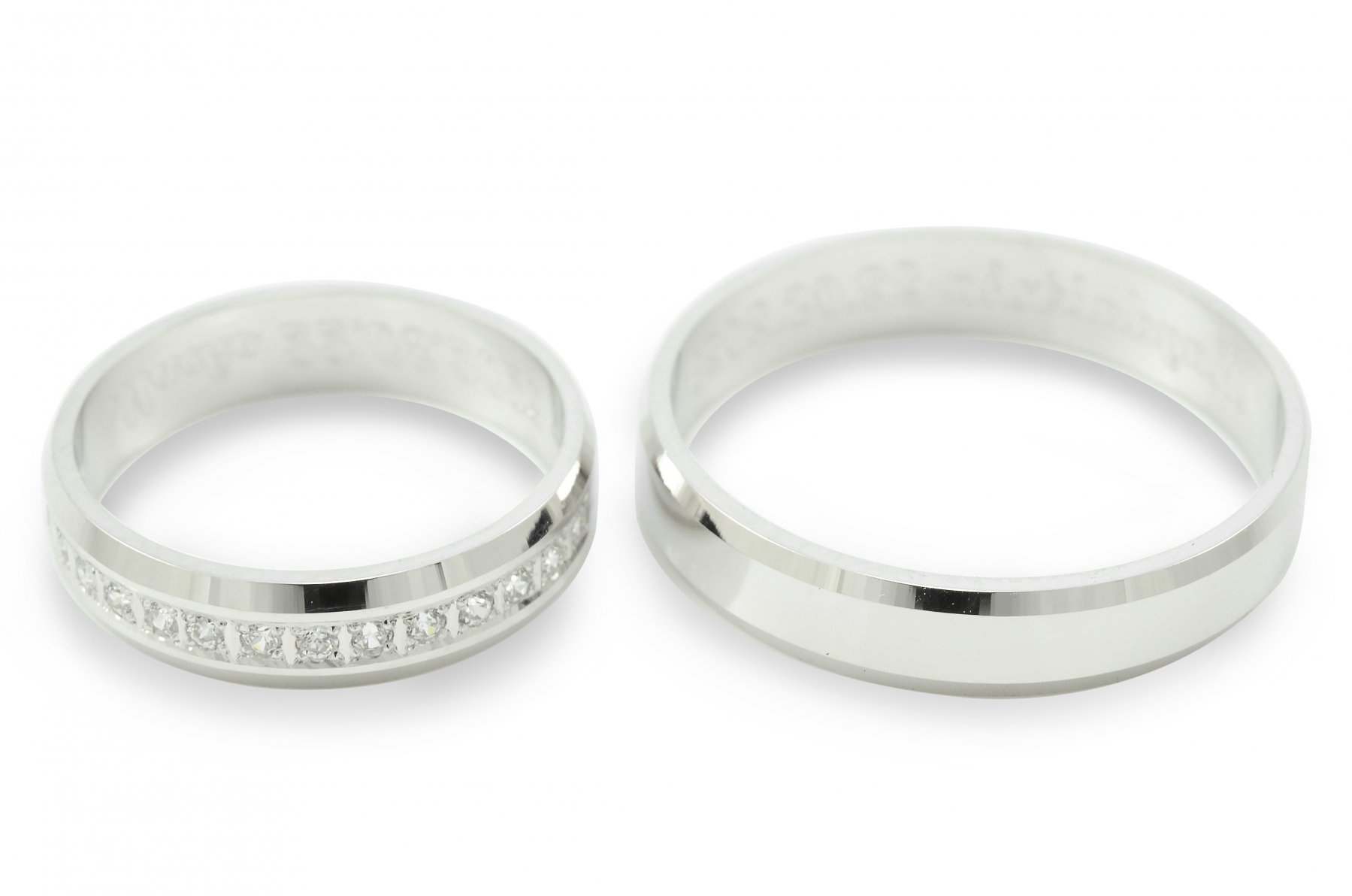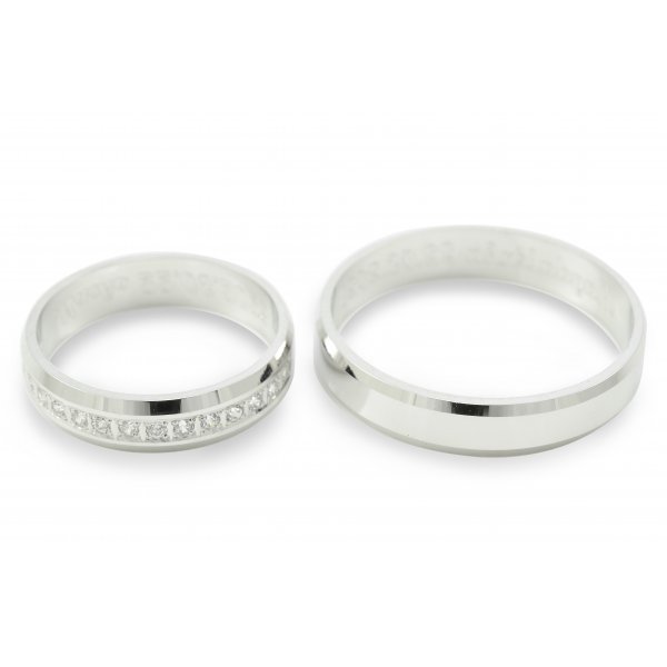 V dámskej svadobnej obrúčke je osadených 30 ks kameňov dookola celej svadobnej obrúčky. (počet fasovaných zirkónov záleží od veľkosti obrúčky.Ak si vyberiete fasovať diamanty budeme vás kontaktovať koľko diamantov bude zafasovaných vo vašej veľkosti obrúčky. Pri zirkónoch je cena nemenná bez ohľadu na počet fasovaných kameňov.) Hrany obrúčok sú mierne zrezané diamantovým nožom pre lepší komfort nosenia.