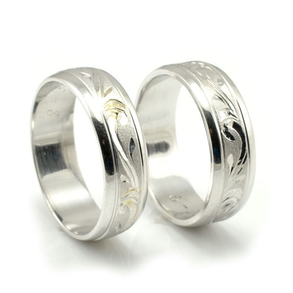 Svadobné obrúčky vyrobené z bieleho zlata. Pár poľgulatých obrúčok širokých 6 mm. Kombinácia lesklého a matného opracovania zlata. Stredom a po celom obvode obrúčok sa tiahne rytina pripomínajúca slnkom zaliate vzory malieb z malebných Čičmianskych chalúpok. Dve ryhy vytvorené diamantovým nožom, ktoré sa tiahnu po celom obvode svadobných obrúčok zvýrazňujú dokonalý odlesk rytiny. Kraje sú oblé a zeleštené do maximálneho lesku. Šírka strednej časti obrúčok je 3 mm. Lesklé časti po krajoch merajú približne 1,5 mm. Obidve svadobné obrúčky pokovované rhódiom pre dokonalú bielu farbu. Do tohoto typu svadobných obrúčok štandardne nefasujeme žiaden kameň. V prípade akejkoľvek zmeny nás kontaktujte telefonicky alebo mailom. Dámska a pánska svadobná obrúčka je identická. Poctivá slovenská a najmä ručná výroba svadobných obrúčok. Gravírovanie mien a dátumov do obrúčok je u nás zadarmo.