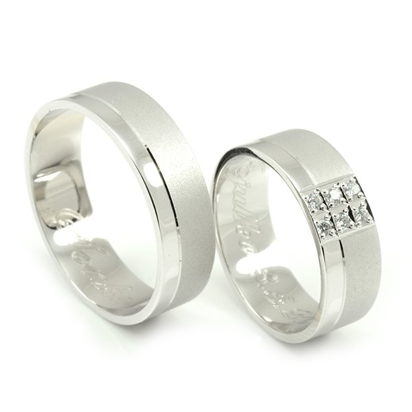 Svadobné obrúčky vyrobené z bieleho zlata. Pár plochých obrúčok širokých 6 mm. Obidve svadobné obrúčky sú povrchovo upravené pomocou piesku. Následne sú porhódiované, čo im dodáva krásnu bielu farbu. Svadobné obrúčky sú rozdelené na dve časti. Prvá, matná časť zaberá približne dve tretiny obrúčky a je upravená pomocou piesku. Druhá, lesklá časť zaberá približne jednu tretinu obrúčky a je zaleštená do maximálneho lesku. Tieto dve časti rozdeľuje drážka vytvorená pomocou diamantového noža. Drážka je vysokého lesku a tiahne sa po celom obvode obidvoch svadobných obrúčok. V dámskej svadobnej obrúčke je zafasovaných šesť kusov zirkónov o veľkosti 1,5 mm. Na vyžiadanie osadíme do dámskej aj pánskej svadobnej obrúčky aj viacej zirkónov alebo diamantov..V prípade akejkoľvek zmeny nás kontaktujte telefonicky alebo mailom.Tento typ svadobných obrúčok vyrobíme v akejkoľvek farbe zlata. Poctivá slovenská a najmä ručná výroba svadobných obrúčok. Gravírovanie mien a dátumov do obrúčok je u nás zadarmo. Krásne balenie v podobe krabičky z dreva a kože je v našom zlatníctve samozrejmosťou.