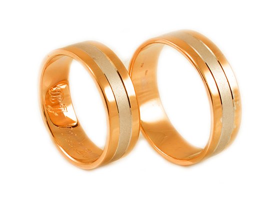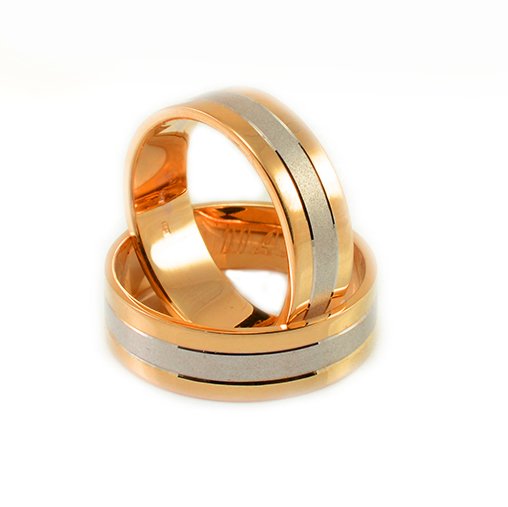 Svadobné obrúčky vyrobené z červeného a bieleho zlata. Pár plochých obrúčok širokých 6 mm. Kombinácia lesklých a matných častí. Stredná časť svadobných obrúčok je vyrobená z bieleho zlata a je povrchovo upravená pomocou piesku. Kraje svadobných obrúčok sú vyhotovené z lesklého červeného zlata. Lesklé časti sú rovnako široké ako tá pieskovaná, čiže približne 2 mm. Navzájom ich oddeľujú dve drážky vytvorené pomocou diamantového noža, ktoré sa tiahnu po celom obvode svadobných obrúčok. Kraje oboch svadobných obrúčok sú jemne zrazené pre komfortnejší pocit pri nosení.