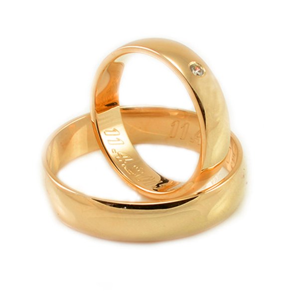 Svadobné obrúčky vyrobené z červeného zlata. Pár polguľatých obrúčok širokých 5 mm. Klasický typ svadobných obrúčok, ktoré očarujú zákazníkov svojou jednoduchosťou a praktickosťou. Oblý tvar zaručuje komfortné nosenie. V dámskej osadený jeden kus kamienka a priemere 2 mm.