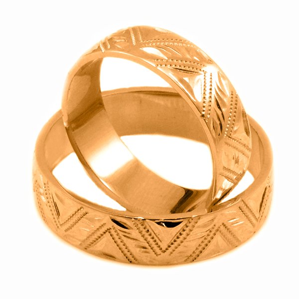 Svadobné obrúčky vyrobené z červeného zlata. Pár mierne polguľatých obrúčok širokých 5 mm. Krásne svadobné obrúčky nadväzujúce na neošúchanú klasiku v modernom štýle. Ručne gravírované obrúčky. Pri týchto svadobných obrúčkach sme sa nechali inšpirovať čičmanským vzorom.