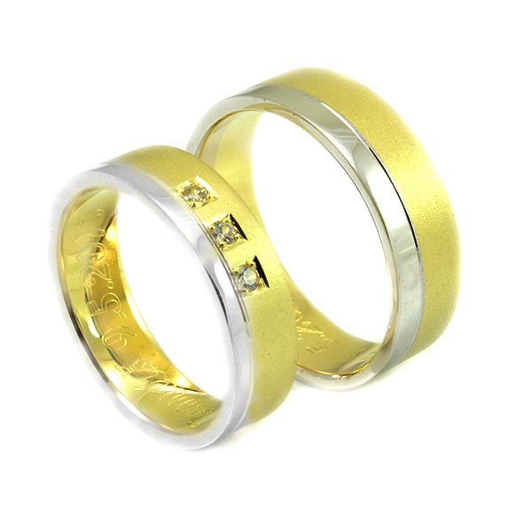 Svadobné obrúčky vyrobené zo žltého a bieleho zlata. Pár plochých obrúčok širokých 6 mm. Väčšia časť široká približne 4 mm je vyrobená zo žltého zlata a jej povrch je povrchovo upravený pieskovaním. Užšia časť svadobných obrúčok je vyrobená z bieleho zlata, ktorá je zaleštená do maximálneho lesku a povrchovo upravená pomocou rhódia. Rhódium slúži na zvýraznenie lesku na častiach alebo na celých obrúčkach vytvorených z bieleho zlata. Tieto dve časti navzájom spája a zvýrazňuje ryha vytvorená diamantovým nožom, ktorá sa tiahne po celom obvode svadobných obrúčok. Do dámskej obrúčky fasujeme 3 kusy zirkónu o veľkosti 2 mm. Na vyžiadanie osadíme do dámskej aj pánskej svadobnej obrúčky aj viacej zirkónov alebo diamantov.V prípade akejkoľvek zmeny nás kontaktujte telefonicky alebo mailom. Tento typ svadobných obrúčok vyrobíme v akejkoľvek farebnej kombinácií zlata. Poctivá slovenská a najmä ručná výroba svadobných obrúčok. Gravírovanie mien a dátumov do obrúčok je u nás zadarmo. Balenie v podobe krásnej krabičky je u nás samozrejmosťou.
