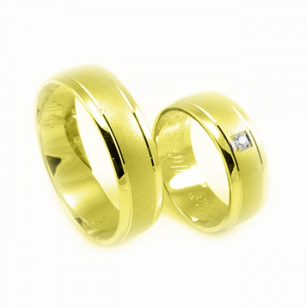 Svadobné obrúčky vyrobené zo žltého zlata. Pár polguľatých obrúčok širokých 5,9 mm. Obidve svadobné obrúčky sú povrchovo upravené pomocou piesku. Dve ryhy vytvorené diamantovým nožom, ktoré sa tiahnu po celom obvode svadobných obrúčok sú na pánskej aj dámskej obrúčke. Lesklé časti , ktoré sa nachádzajú na okrajoch svadobných obrúčok sú jemno zrazené diamantovým nožom. To vytvára dojem, že stredná časť je osadená o niečo vyššie. V dámskej je zafasovaný zirkón o veľkosti 2 mm. Na vyžiadanie osadíme do dámskej aj pánskej svadobnej obrúčky aj viacej zirkónov alebo diamantov.V prípade akejkoľvek zmeny nás kontaktujte telefonicky alebo mailom. Tento typ svadobných obrúčok vyrobíme v akejkoľvek farbe zlata. Poctivá slovenská a najmä ručná výroba svadobných obrúčok. Gravírovanie mien a dátumov do obrúčok je u nás zadarmo. Krásne balenie v podobe krabičky z dreva a kože je v našom zlatníctve samozrejmosťou.