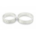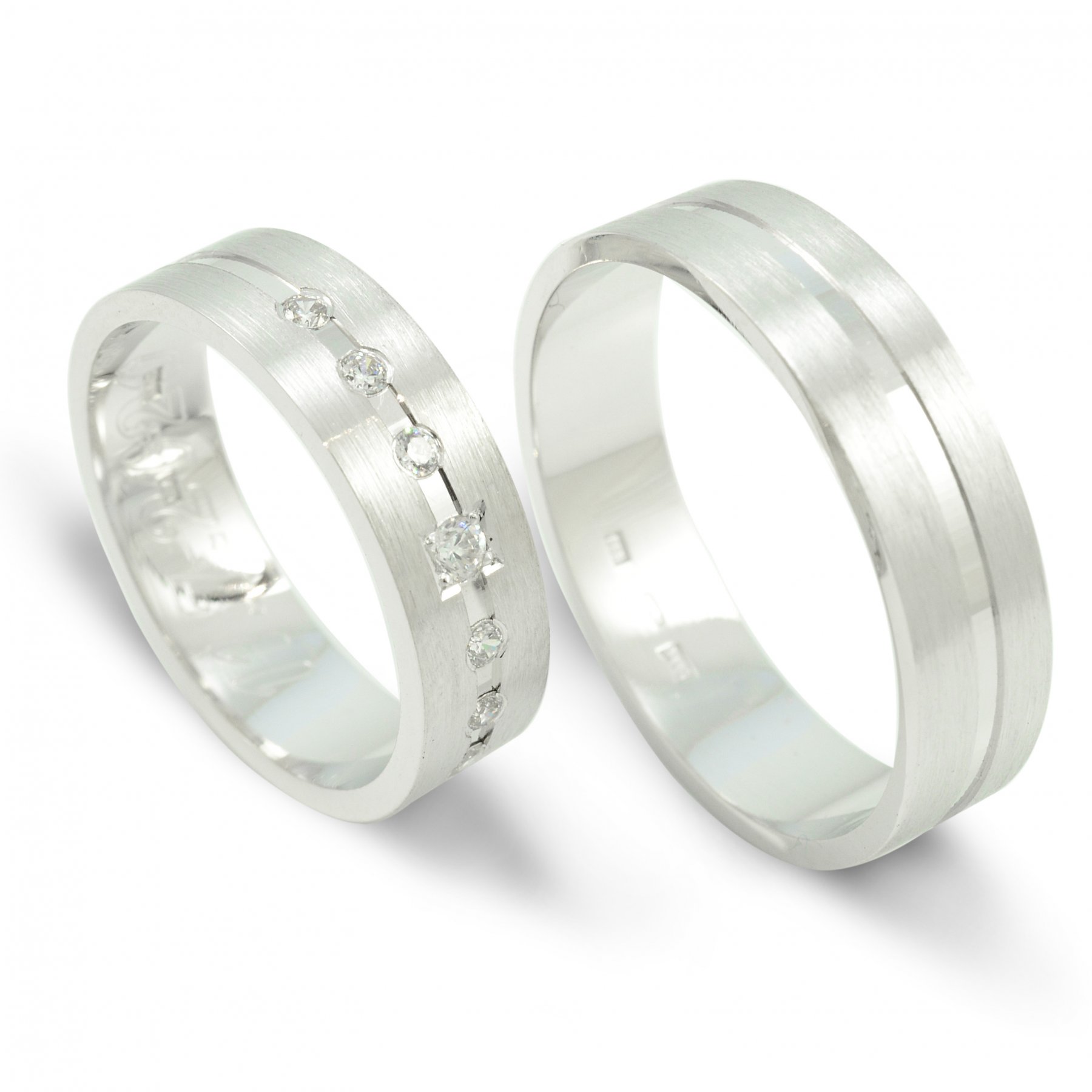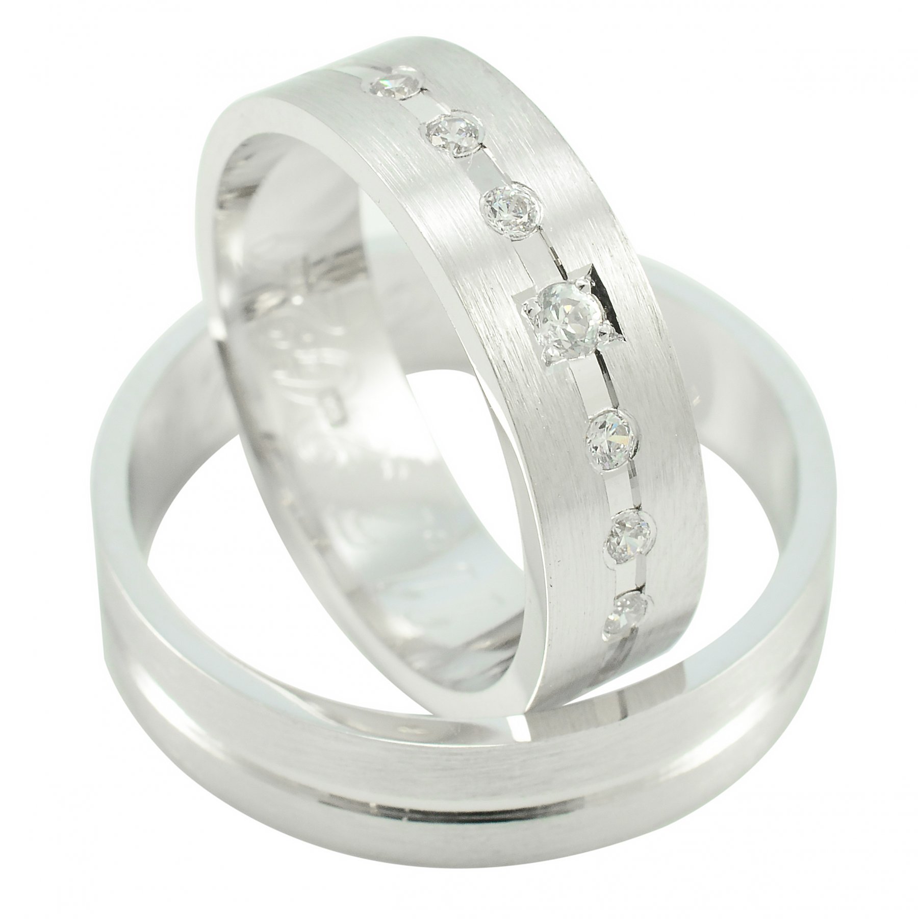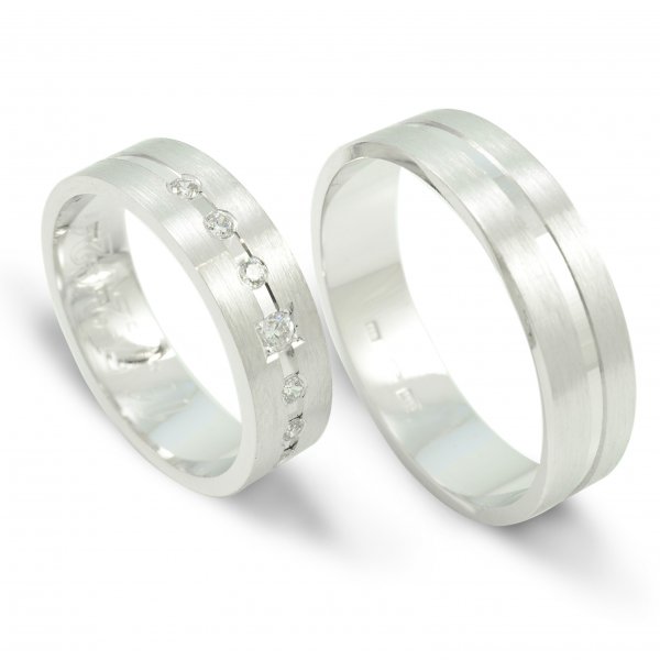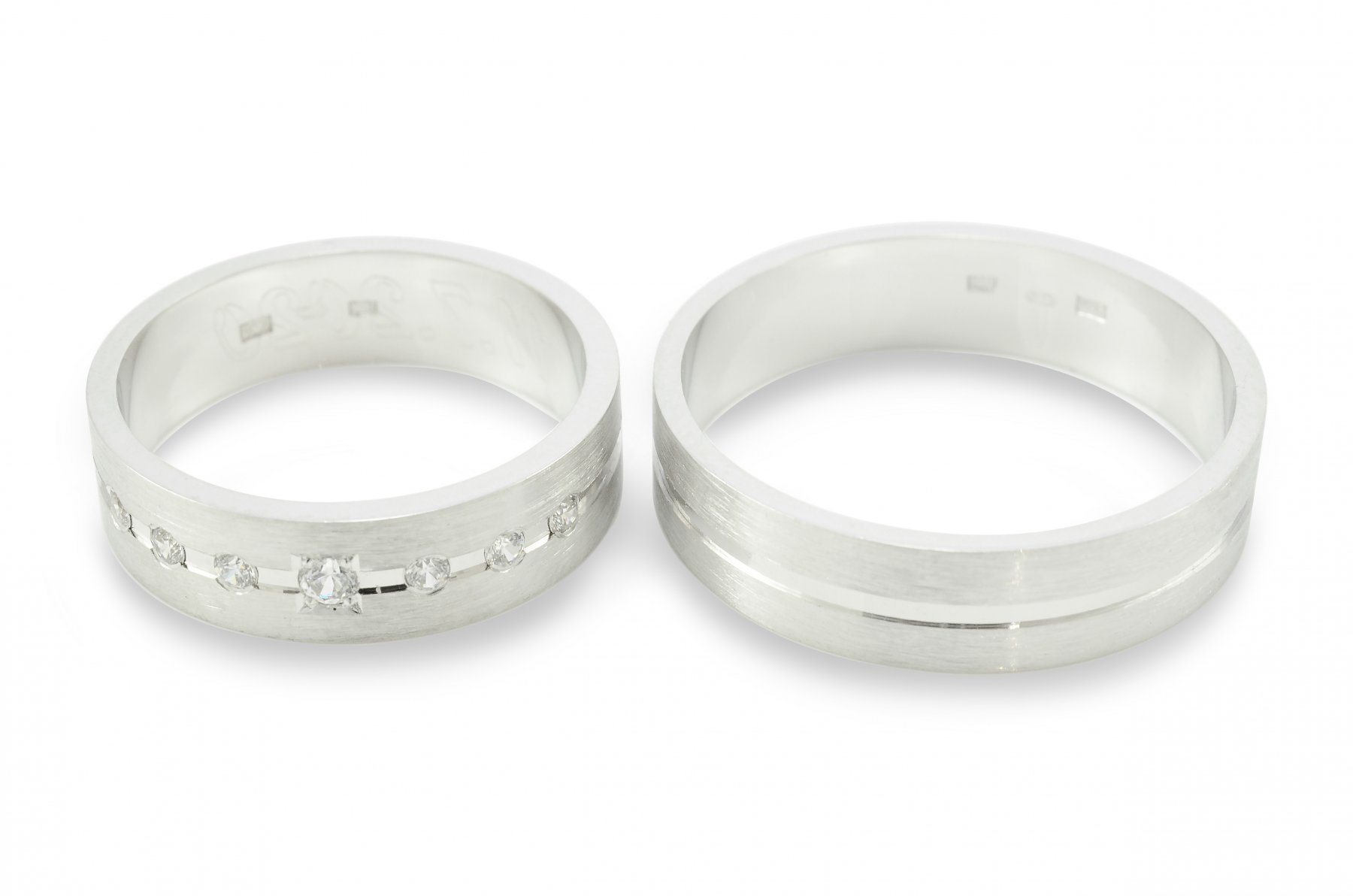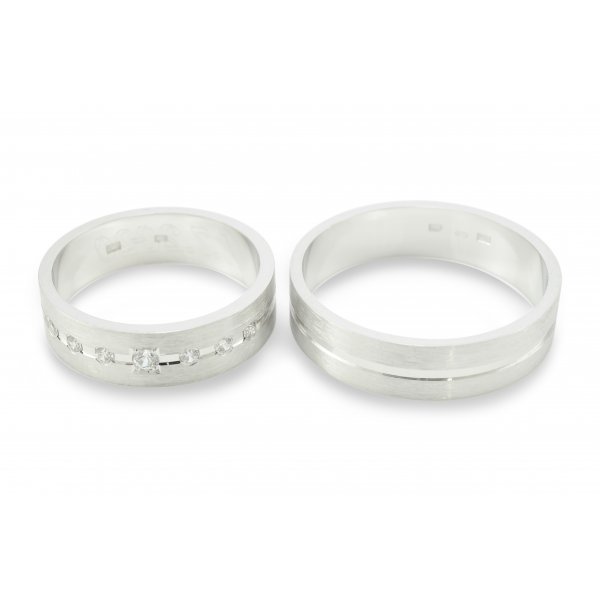 Svadobné obrúčky vyrobené z bieleho zlata. Pár plochých obrúčok širokých 6 mm. Kombinácia lesklých a matných častí. Svadobné obrúčky tohoto typu sú povrchovo upravené pomocou piesku. Lesklá stredná časť je široká približne 1,5 mm a je upravená pomocou diamantového noža v podobe vybratej drážky. V drážke je 6 zirkónov fasovaných do štvorca1,5 mm a jeden v strede je fasovaný do guličky. Pieskované časti po obidvoch stranách sú široké cca 2.25 mm. Tieto dve časti navzájom spája a zvýrazňuje ryha vytvorená diamantovým nožom, ktorá sa tiahne po celom obvode svadobných obrúčok. Kraje obrúčok sú jemno zrazené pre lesklejší efekt taktiež diamantovým nožom.