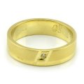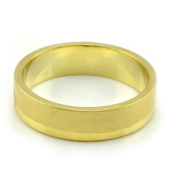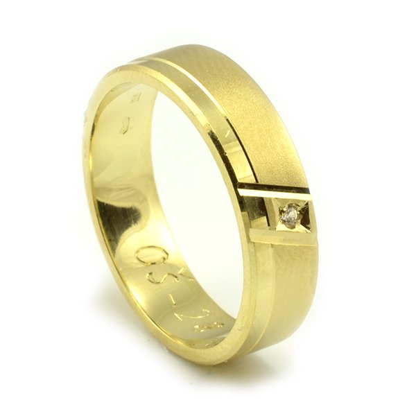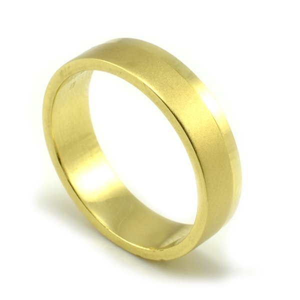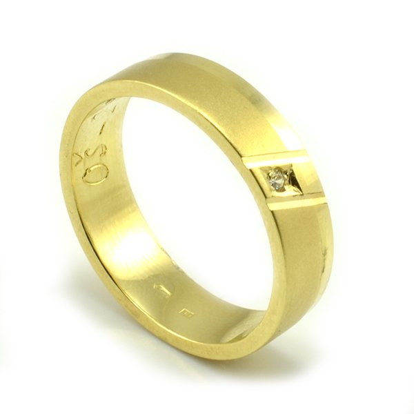 Svadobné obrúčky vyrobené zo žltého zlata. Pár plochých obrúčok širokých 5 mm. Svadobné obrúčky skladajúce sa z dvoch navzájom prepojených častí. Širšia časť má približne 3,5 mm a je povrchovo upravená pomocou piesku. Užšia časť má asi 1,5 mm a je zaleštená do maximálneho lesku. V dámskej svadobnej obrúčke je zafasovaný zirkón o veľkosti 1,5 mm, ktorý je ohraničený dvomi šikmímy drážkami. Tieto drážky sú vytvorené pomocou diamantového noža a najmä preto majú krásny odlesk. Pánska obrúčka je identická k dámskej, ale bez kameňa. Na vyžiadanie osadíme kameň aj do pánskej svadobnej obrúčky.V prípade akejkoľvek zmeny nás kontaktujte telefonicky alebo mailom. Jednoduchá obrúčka na celý život. Tento typ svadobných obrúčok vyrobíme v akejkoľvek farebnej kombinácií zlata. Poctivá slovenská a najmä ručná výroba svadobných obrúčok. Gravírovanie mien a dátumov do obrúčok je u nás zadarmo.