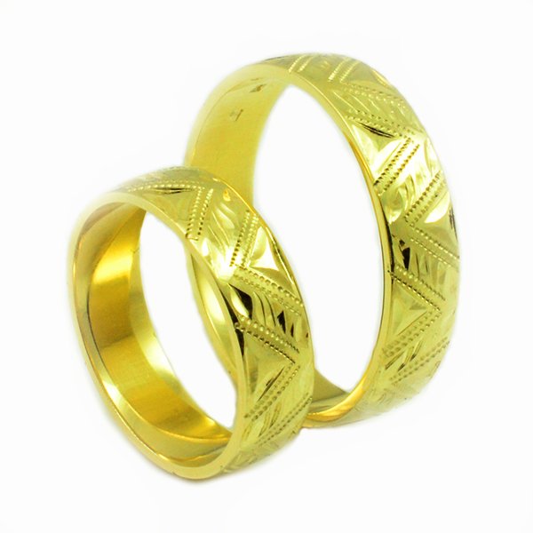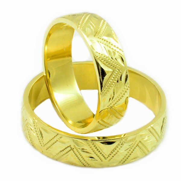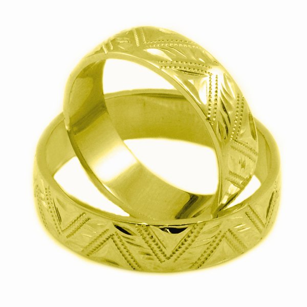 Svadobné obrúčky vyrobené zo žltého zlata. Pár mierne polguľatých obrúčok širokých 5 mm. Krásne svadobné obrúčky nadväzujúce na neošúchanú klasiku v modernom štýle. Ručne gravírované obrúčky. Pri týchto svadobných obrúčkach sme sa nechali inšpirovať čičmanským vzorom.