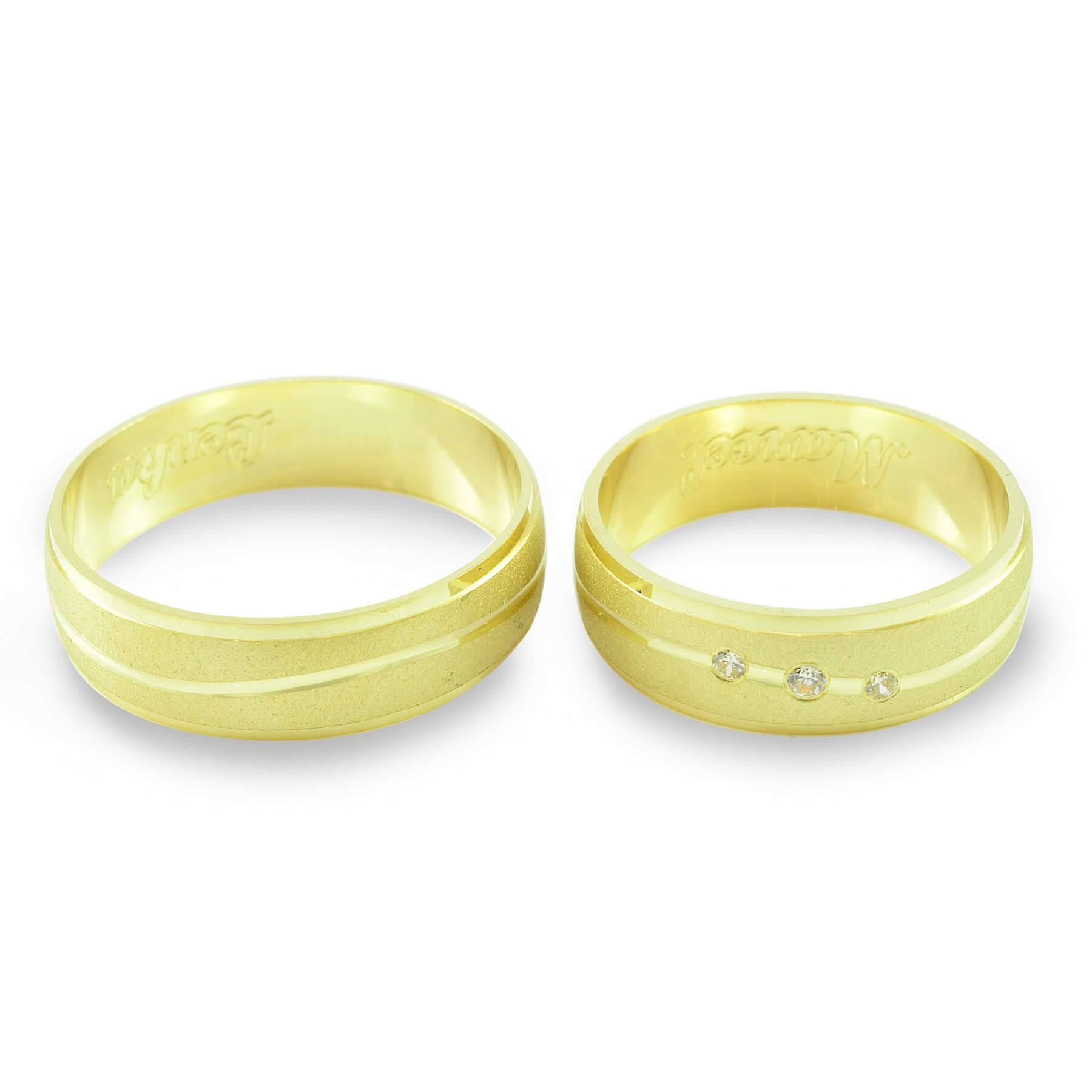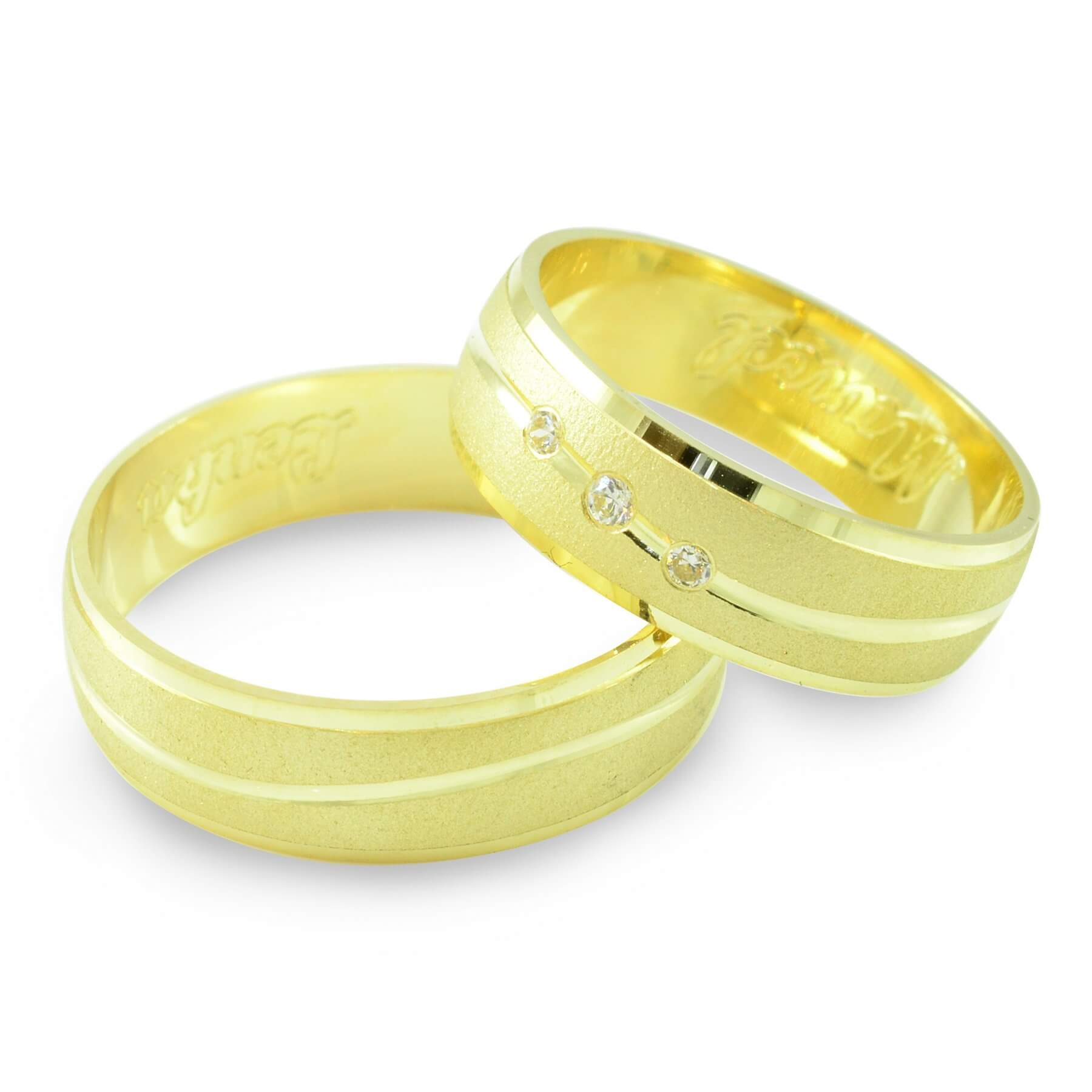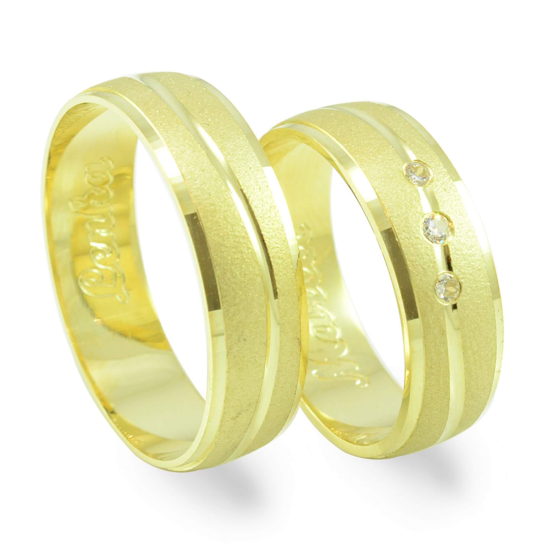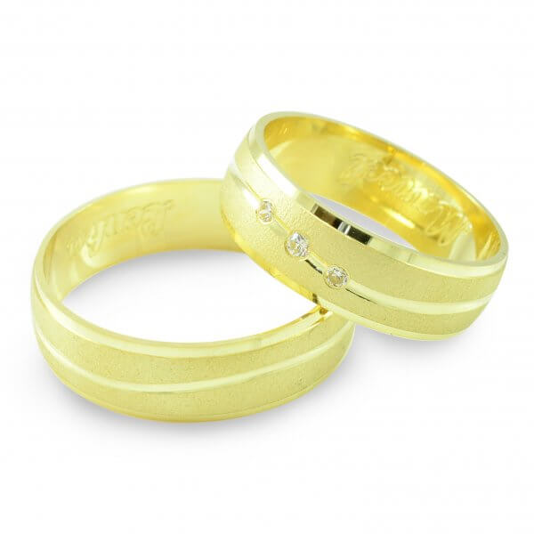 Svadobné obrúčky vyrobené zo žltého zlata. Pár polguľatých obrúčok širokých 6 mm. Po celom obvode svadobných obrúčok sa tiahne nádherná vlnka, ktorá je vytvorená pomocou diamantového noža. Táto vlnka má výrazný odlesk a veľmi pekne kontrastuje s matným okolím. Okraje svadobných obrúčok sú pomocou diamantového noža jemnučko zrazené, čo im dodáva taktiež nádherný odlesk. V dámskej svadobnej obrúčku sú zafasované tri zirkóny. Jeden o veľkosti 1,5 mm a dva o veľkosti 1,25 mm. Pánska obrúčka je v štandarde bez kameňov.
