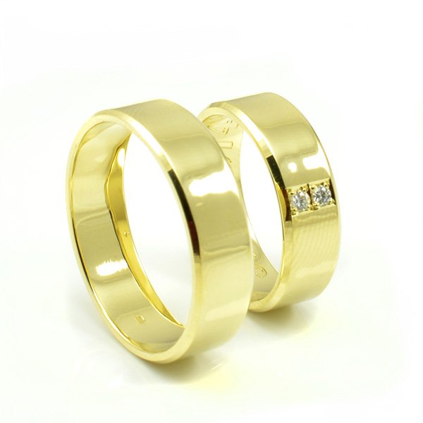 Svadobné obrúčky vyrobené zo žltého zlata. Pár plochých obrúčok širokých 5,5 mm. Veľmi jednoduchý, ale preto aj masívny typ svadobných obrúčok. Obidva kusy sú zaleštené do maximálneho lesku. Zároveň májú výrazne zkosené hrany pomocou diamantového noža pre komfortné nosenie.