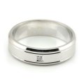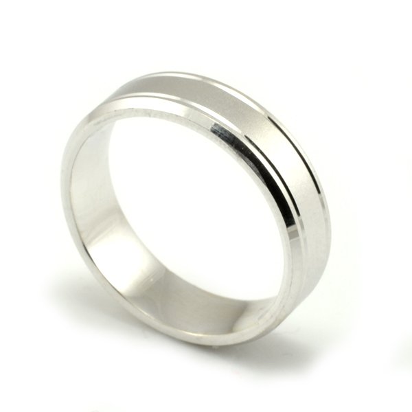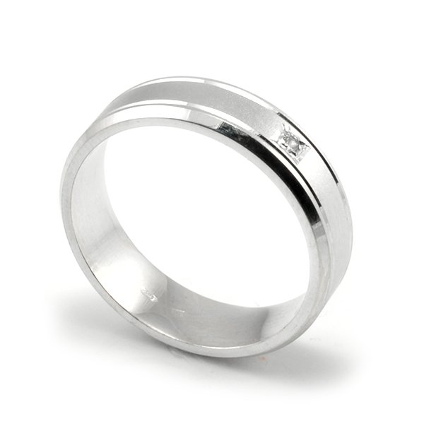 Svadobné obrúčky vyrobené z bieleho zlata. Pár plochých obrúčok širokých 5 mm. Stredná časť je široká približne 2,5 mm a je omatovaná pomocou piesku. Obidva kraje svadobných obrúčok sú zrazené pomocou diamantových nožov pre komfortnejšie nosenie. Zároveň sú zaleštené do maximálneho lesku. Od stredu ich oddeľujú dve lesklé ryhy, ktoré sa tiahnu po celom obvode svadobných obrúčok. V dámskej obrúčke je štandardne zafasovaný 1 kus kameňa o veľkosti 1,5 mm. Kameň je guľatého tvaru, ale pomocou štýlu fasovania vytvára dojem štvorca.Obidve svadobné obrúčky sú pokovované rhódiom pre dokonalú bielu farbu. Na vyžiadanie osadíme do dámskej aj pánskej svadobnej obrúčky aj viacej zirkónov alebo diamantov. V prípade akejkoľvek zmeny nás kontaktujte telefonicky, alebo mailom.Tento typ svadobných obrúčok vyrobíme v akejkoľvek farbe zlata. Poctivá slovenská a najmä ručná výroba svadobných obrúčok. Gravírovanie mien a dátumov do obrúčok je u nás zadarmo.
