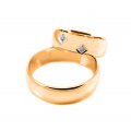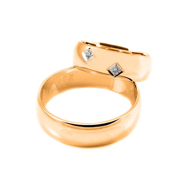 Svadobné obrúčky vyrobené z červeného zlata. Pár polguľatých obrúčok širokých 6 mm. Klasický typ svadobných obrúčok, ktoré očarujú zákazníkov svojou jednoduchosťou a praktickosťou. Oblý tvar zaručuje komfortné nosenie. V dámskej sú osadené dva kusy kameňov do tvaru kosoštvorca.