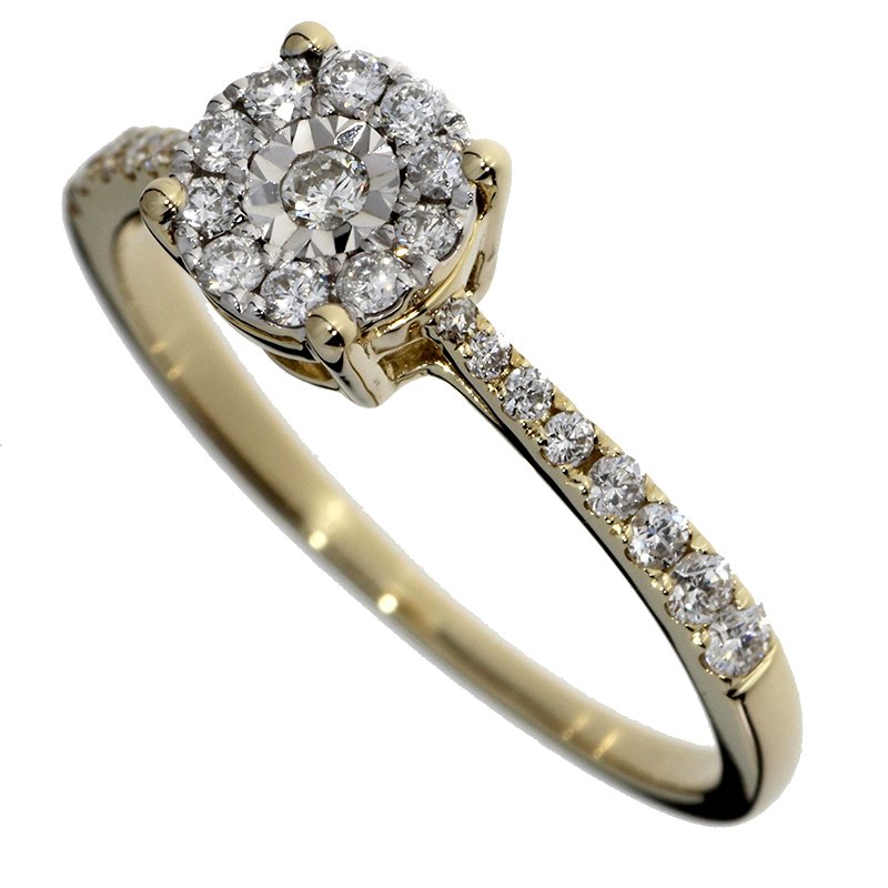 Zásnubný prsteň zo žltého zlata s briliantmi, ktoré sú osadené nielen v centrálnej časti prsteňa, ale aj pozdĺž bočnej šíny. Stredná časť vytvára dojem solitéra. V jeho strede je umiestnený jeden briliant v bielom zlate a okolo sú fasované menšie brilianty. Tie dodávajú prsteňu krásny lesk vďaka ligotajúcim odleskom. Ide o krásny prsteň, ktorý nik neprehliadne. Šperk má 0.20 ct. Je dodávaný v elegantnej krabičke s certifikátom pravosti.