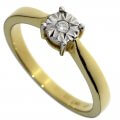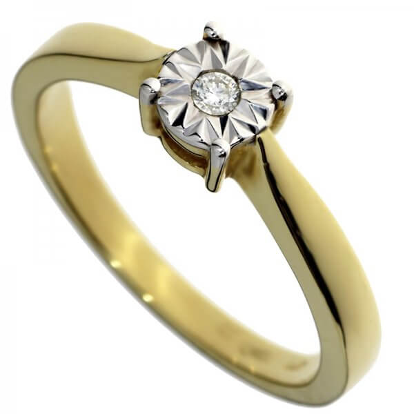Zásnubný prsteň zo žltého zlata s briliantom, ktorý je osadený v zlate z bieleho zlata. Takýmto fasovaním v jemnej kombinácii materiálu získava prsteň eleganciu a na prste pôsobí veľmi decentne. Prsteň má 0,02 ct. Je dodávaný v elegantnej krabičke s certifikátom pravosti.
