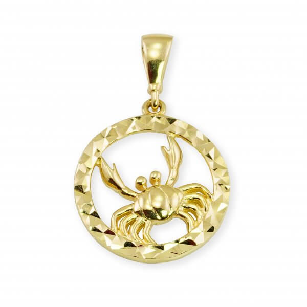 Prívesok v tvare kruhu je vyrobený zo žltého 14 karátového zlata. Prívesok má detailné vypracovanie, po obvode je gravírovaný. V strede je symbol znamenia Rak. Povrch prívesku je hladký vo vysokom lesku. Vhodný tip na darček k narodeninám, prijímaniu, maturitám.