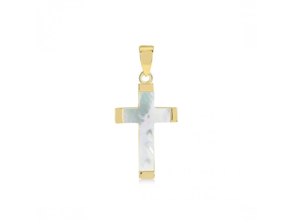 Zlatý prívesok v tvare kríža zo žltého zlata s perleťou.